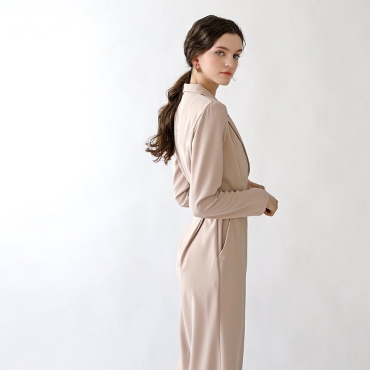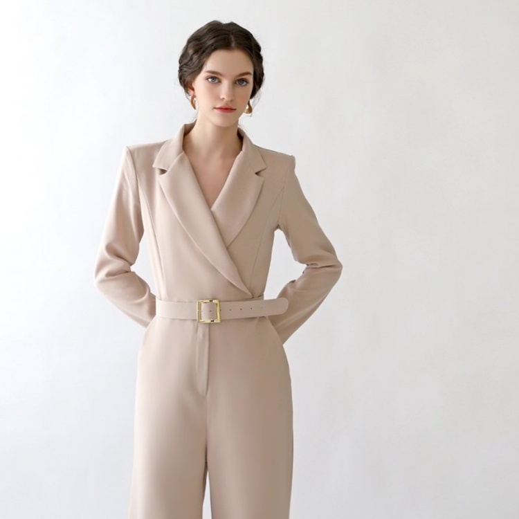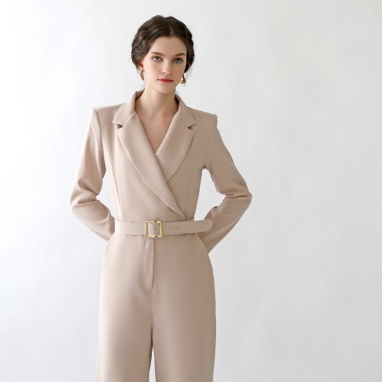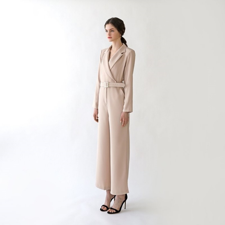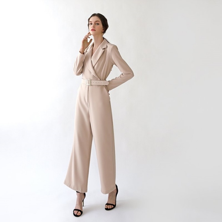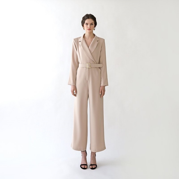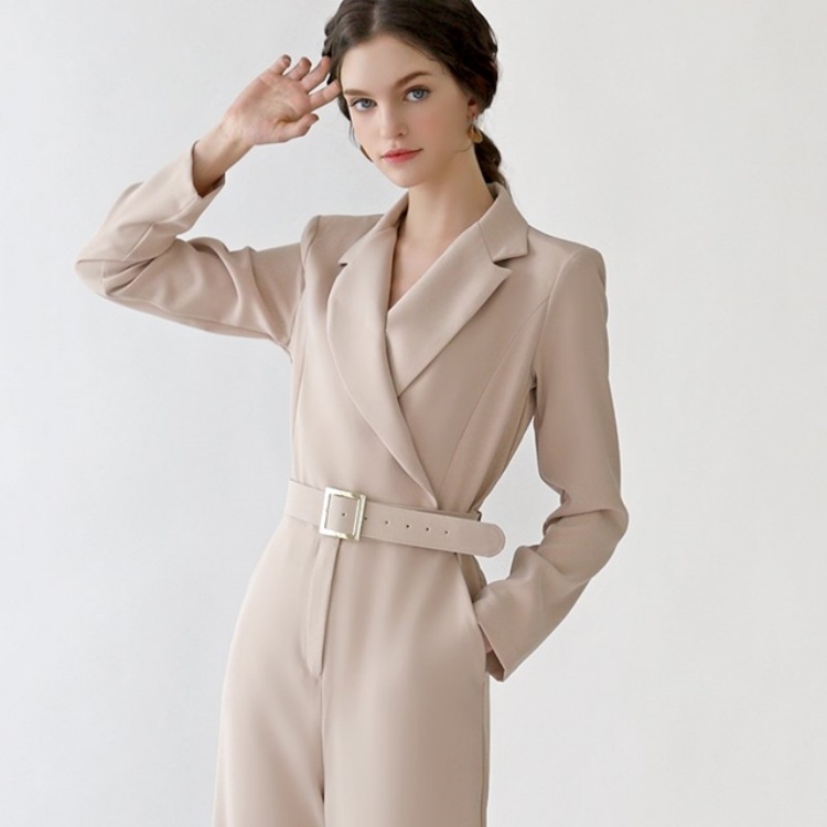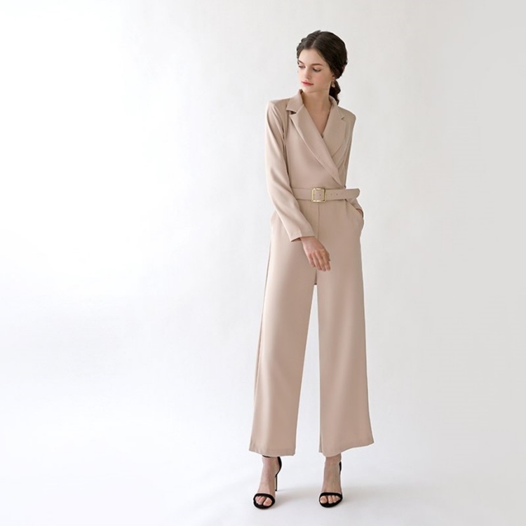 테일러드 카라 벨티드 긴팔 정장 와이드 점프수트