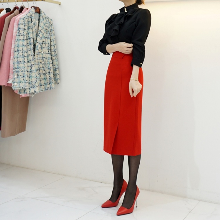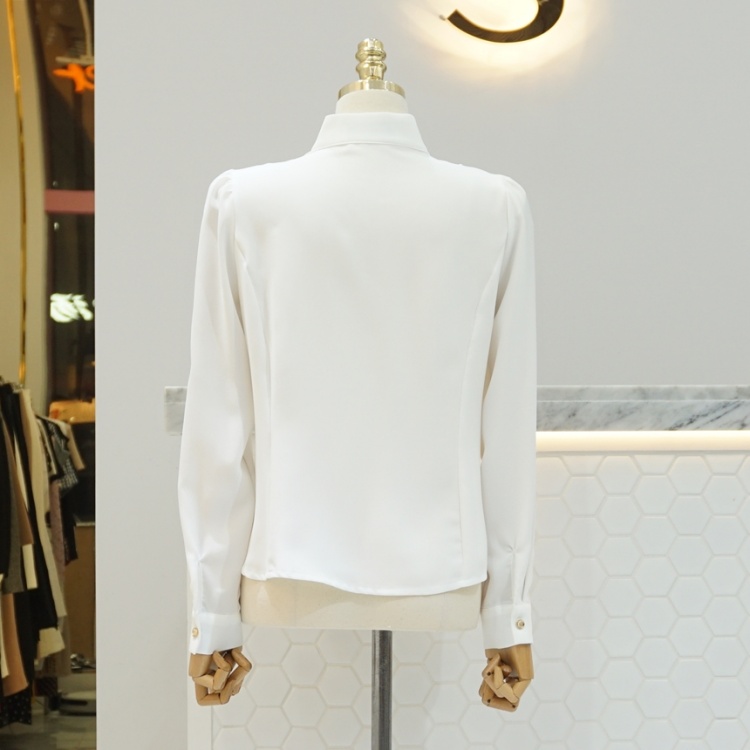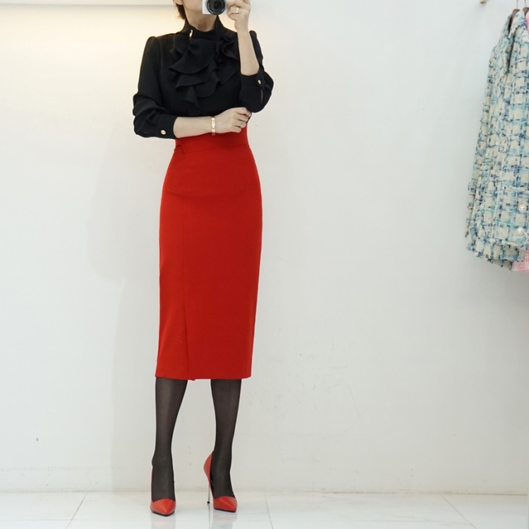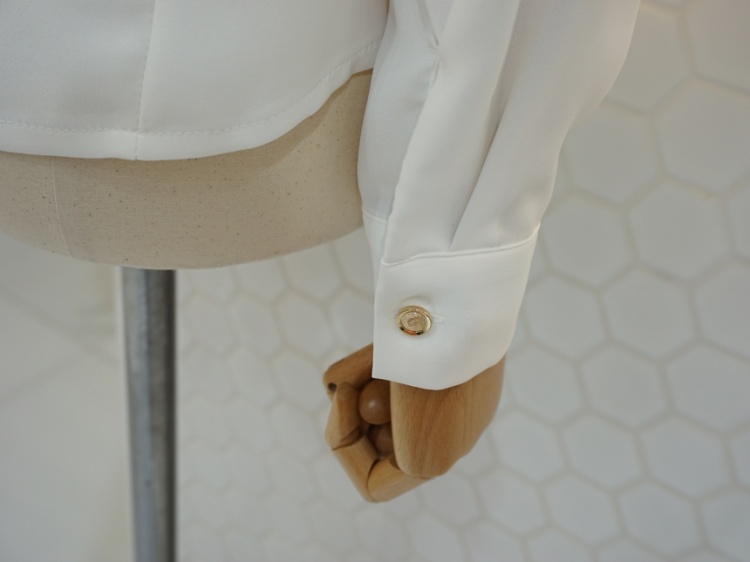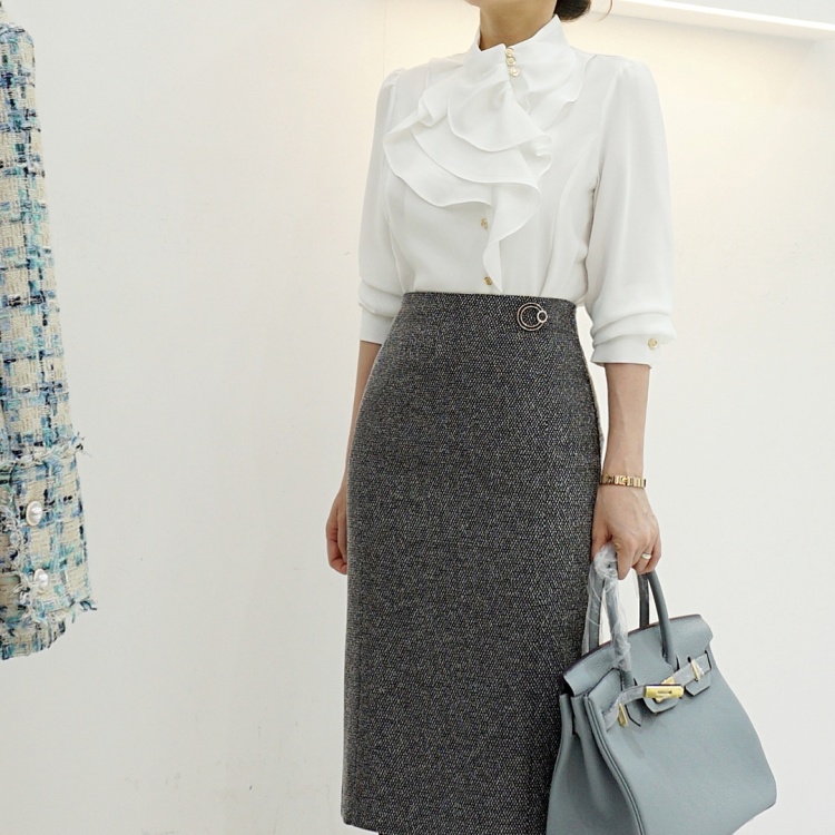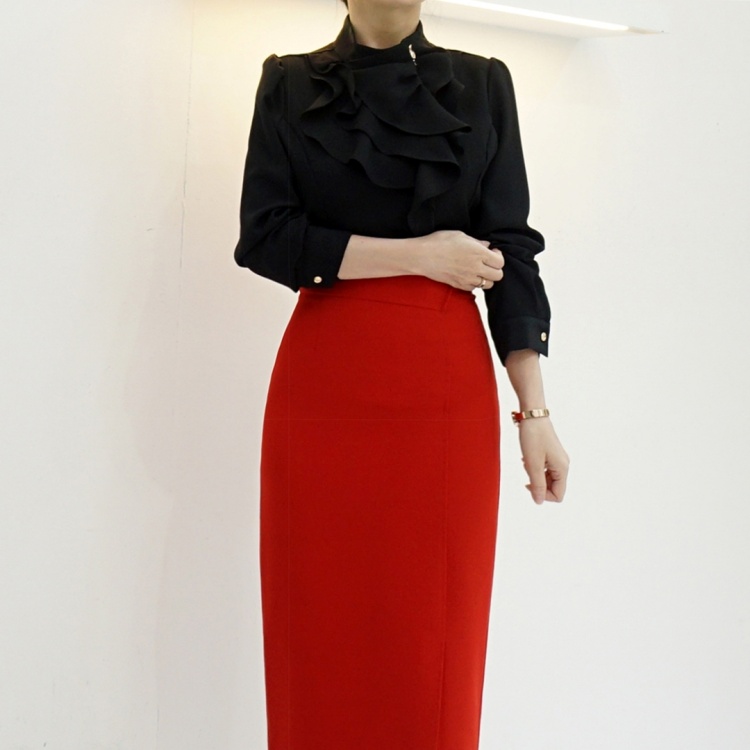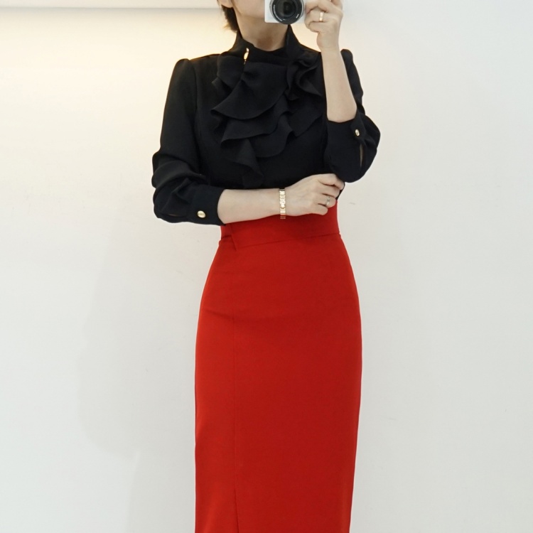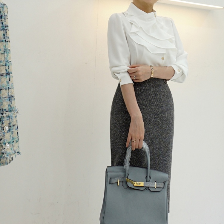 엘레강스 사선 반하이넥 프릴 쉬폰 블라우스