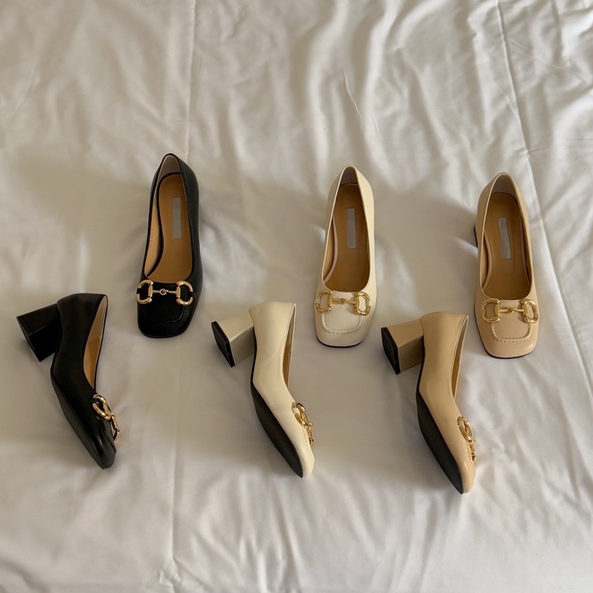 여성 펌프스힐 골드 홀스빗 스퀘어 미들힐 펌프스