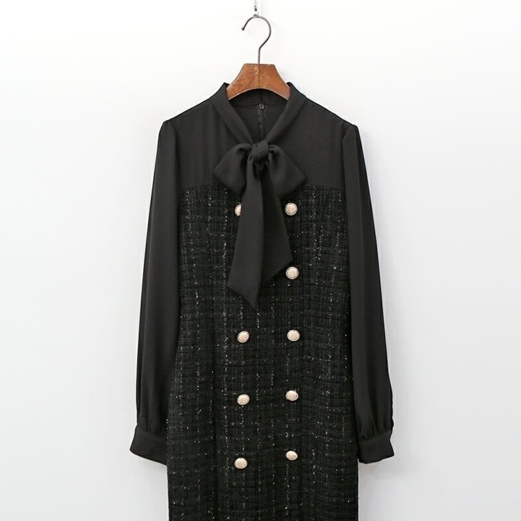 트위드 쉬폰 배색 콤비 H라인 정장 원피스