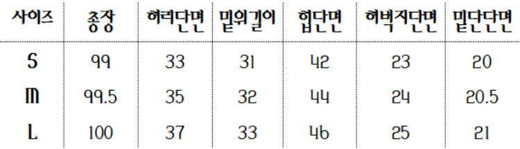 하단 사이즈 표를