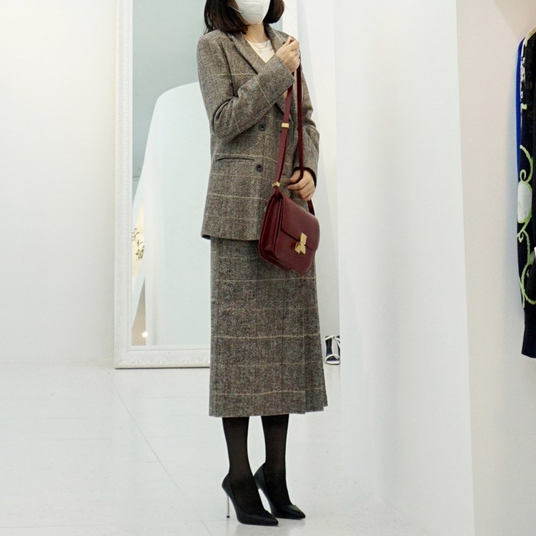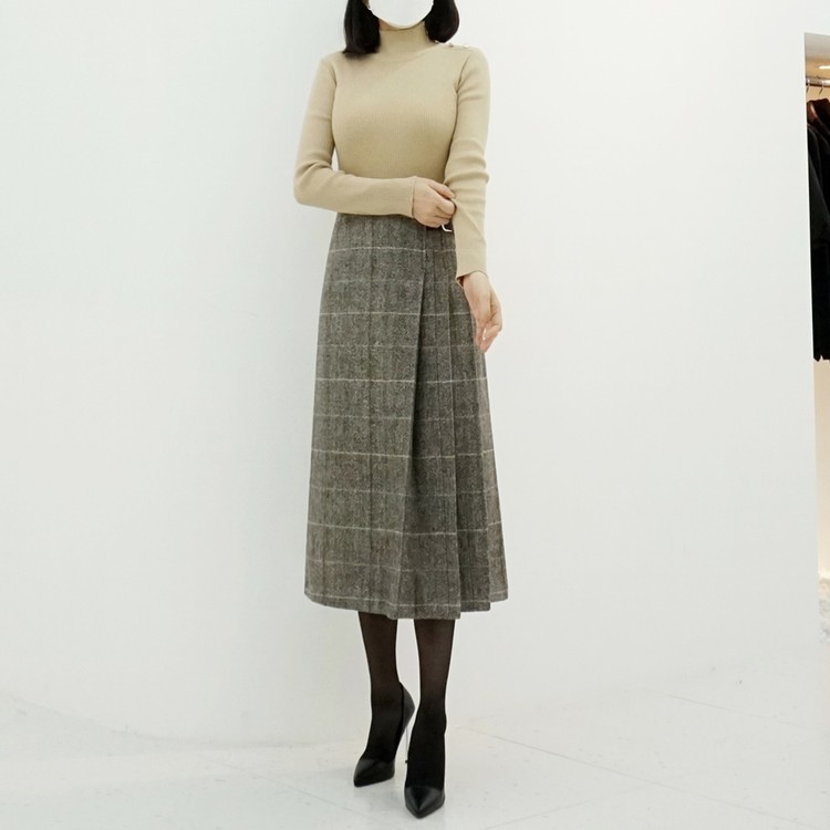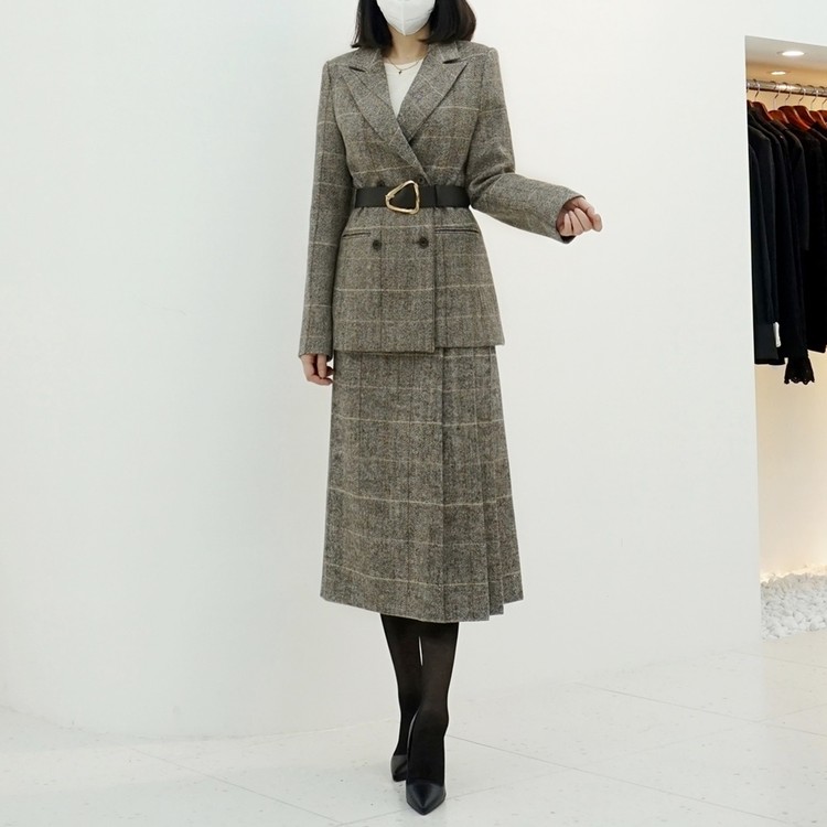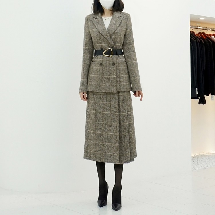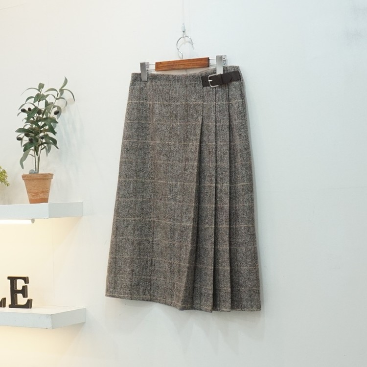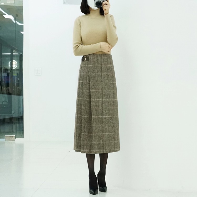 겨울 헤링본 울 글렌체크 버클 벨티드 스커트