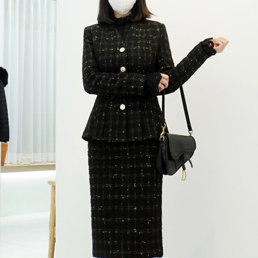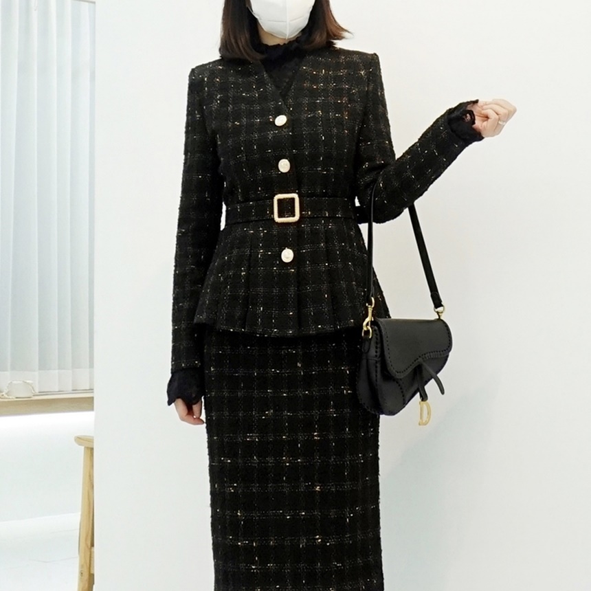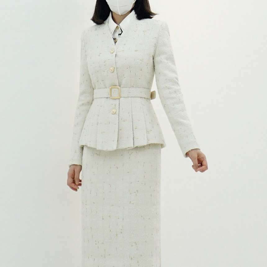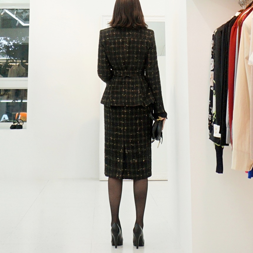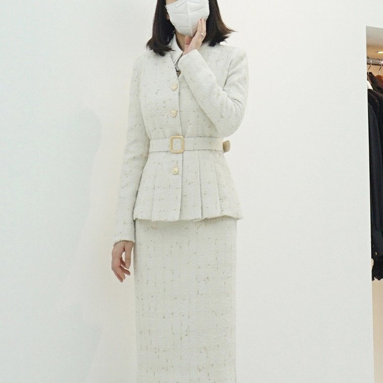 여성 벨티드 페플럼 트위드 정장 자켓
