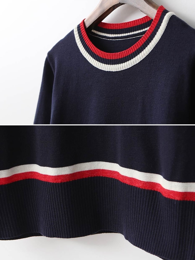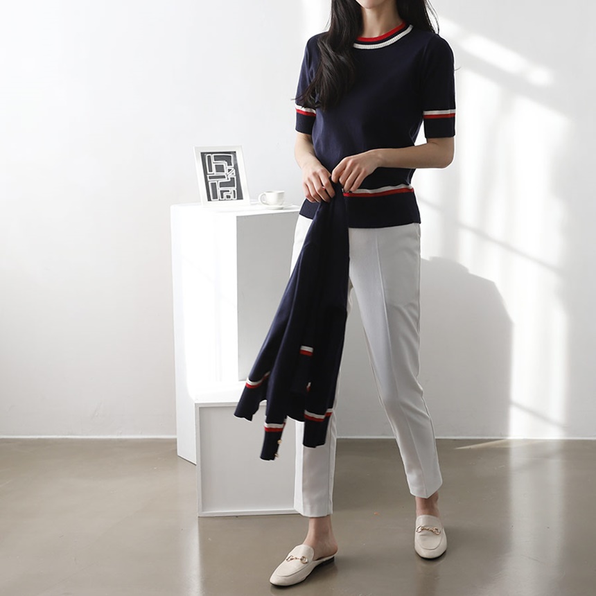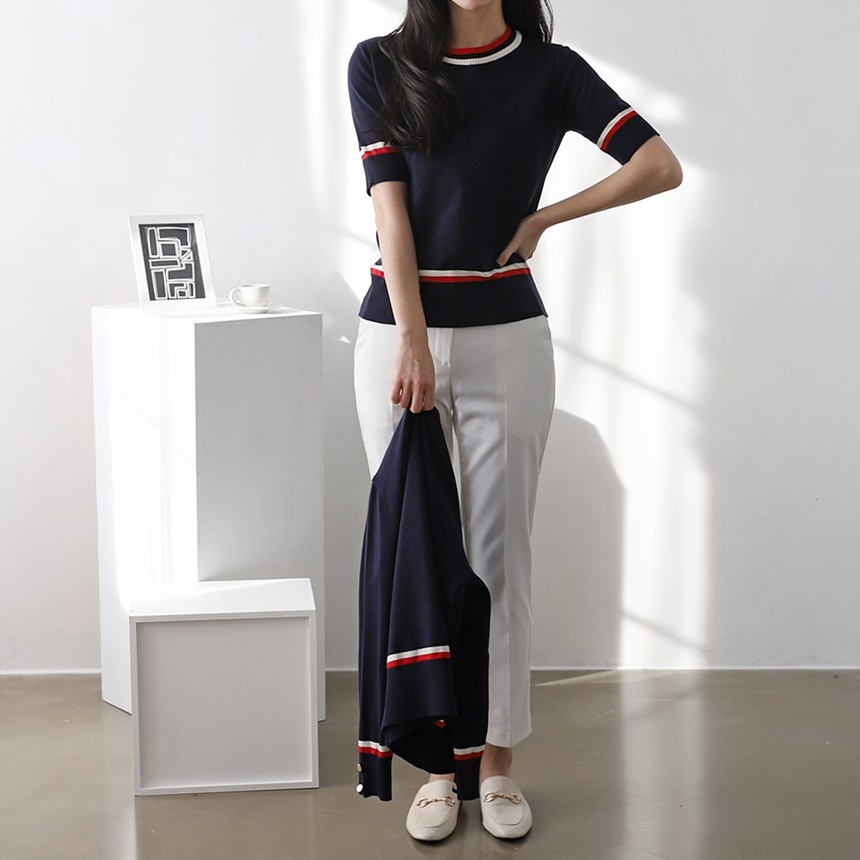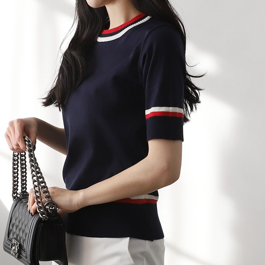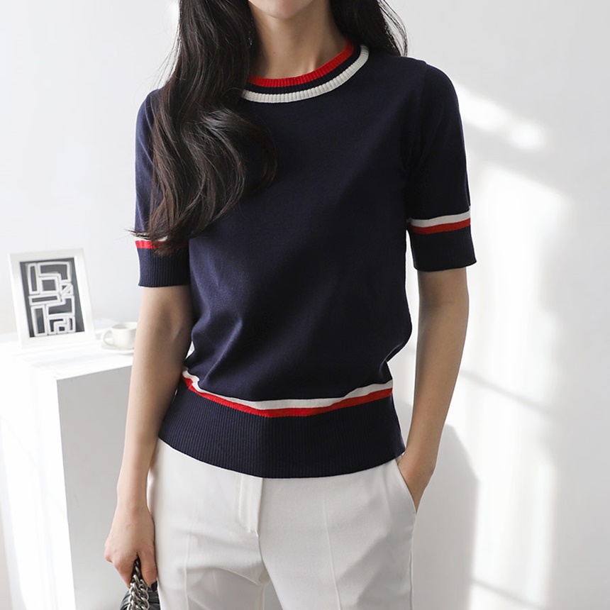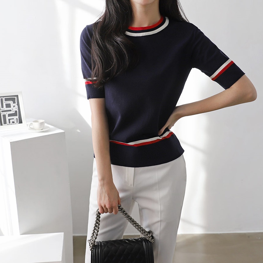 깔끔한 투톤 배색 라운드 반팔 니트 티셔츠
