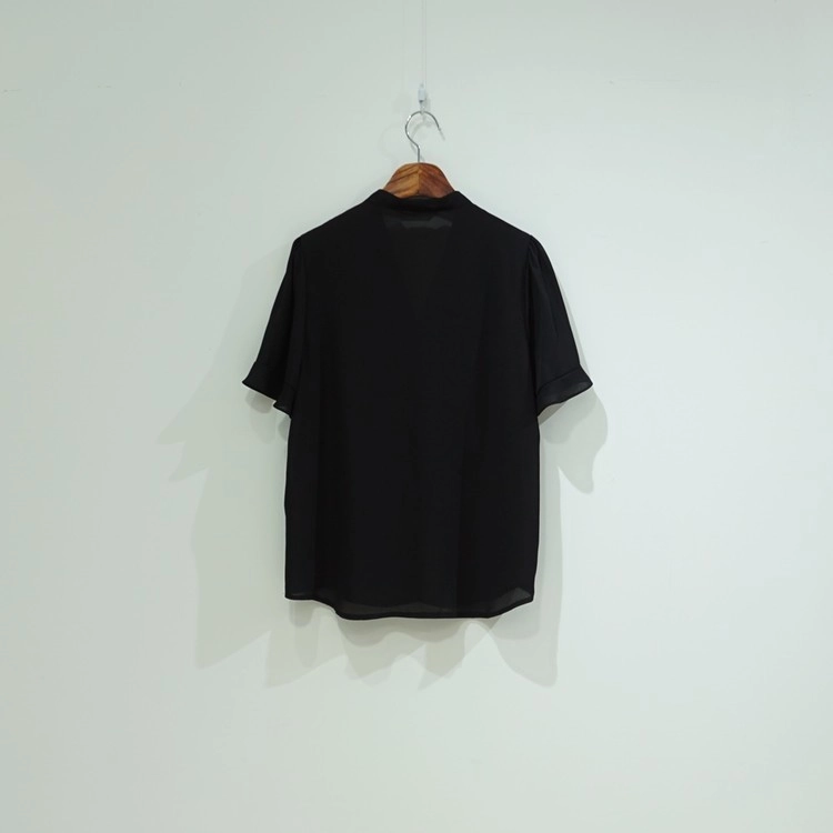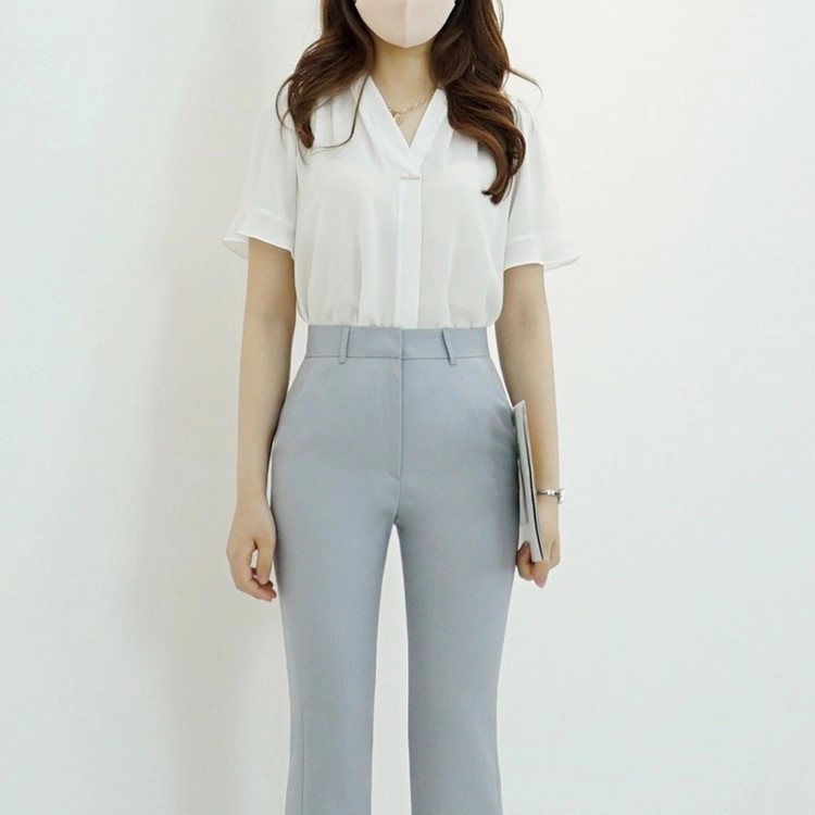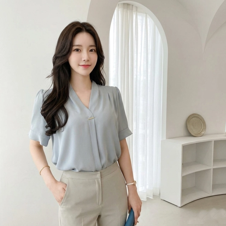 브이넥 골드팁 숄더 핀턱 반팔 쉬폰 여름 블라우스