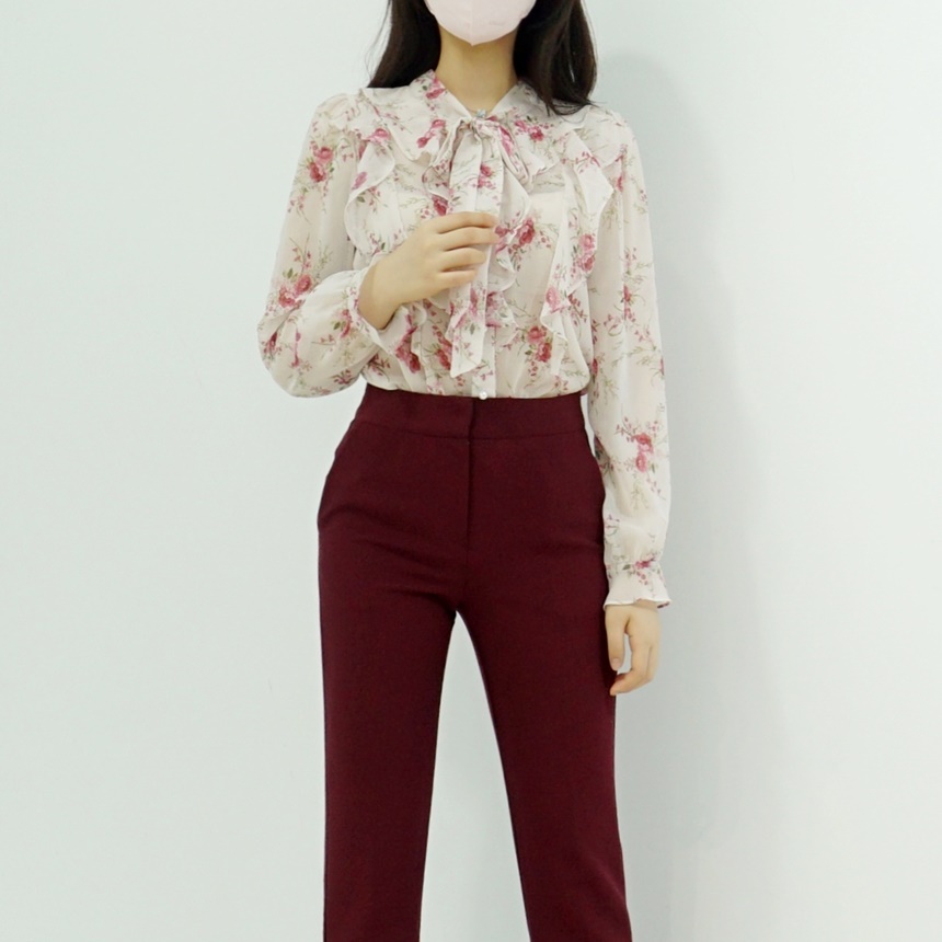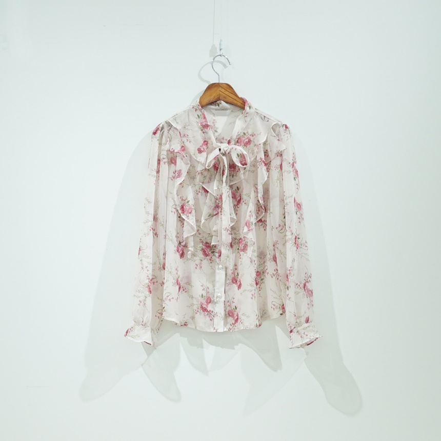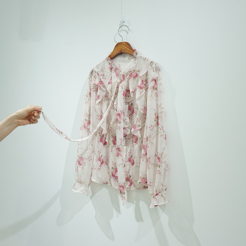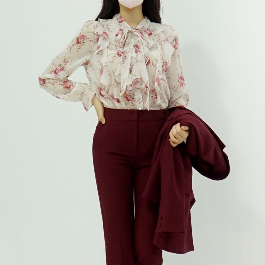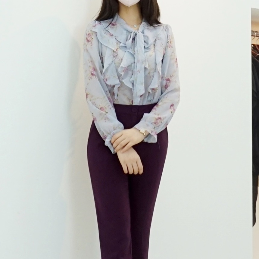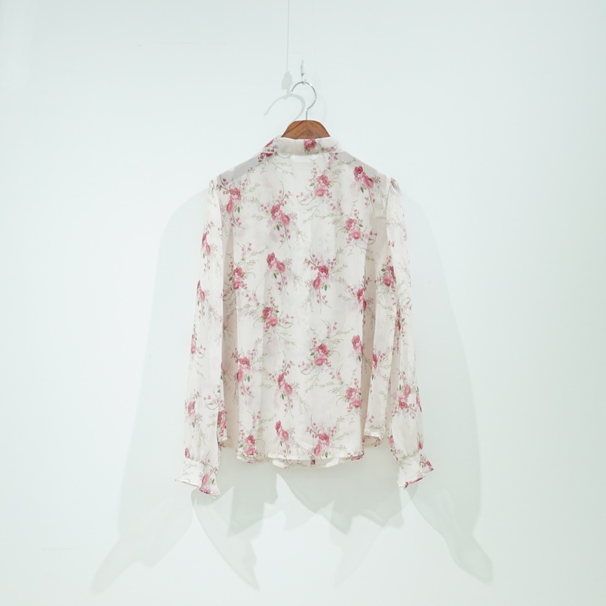 리본 타이 플라워 쉬폰 블라우스