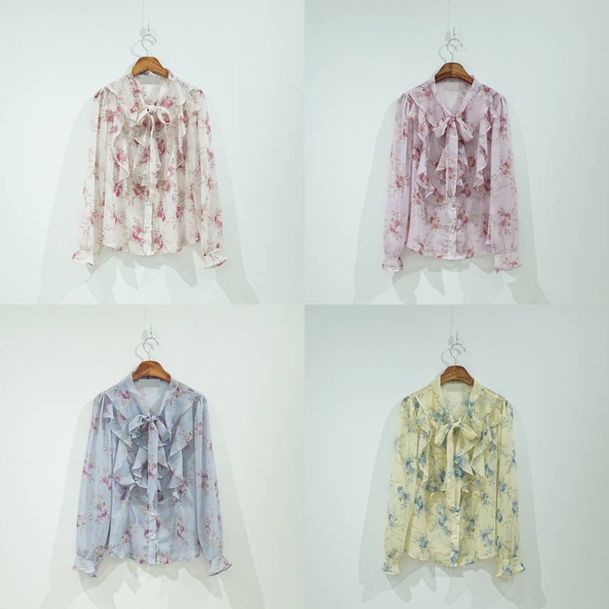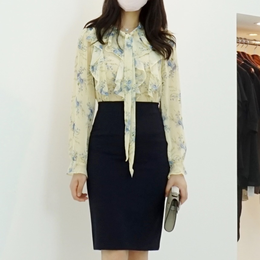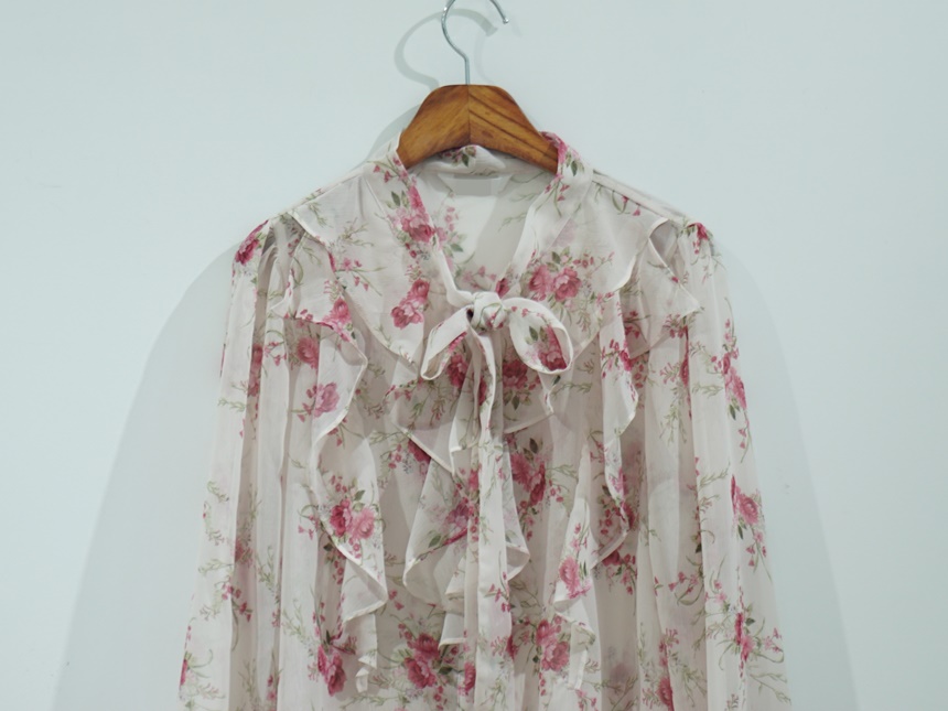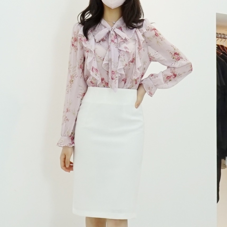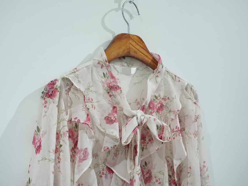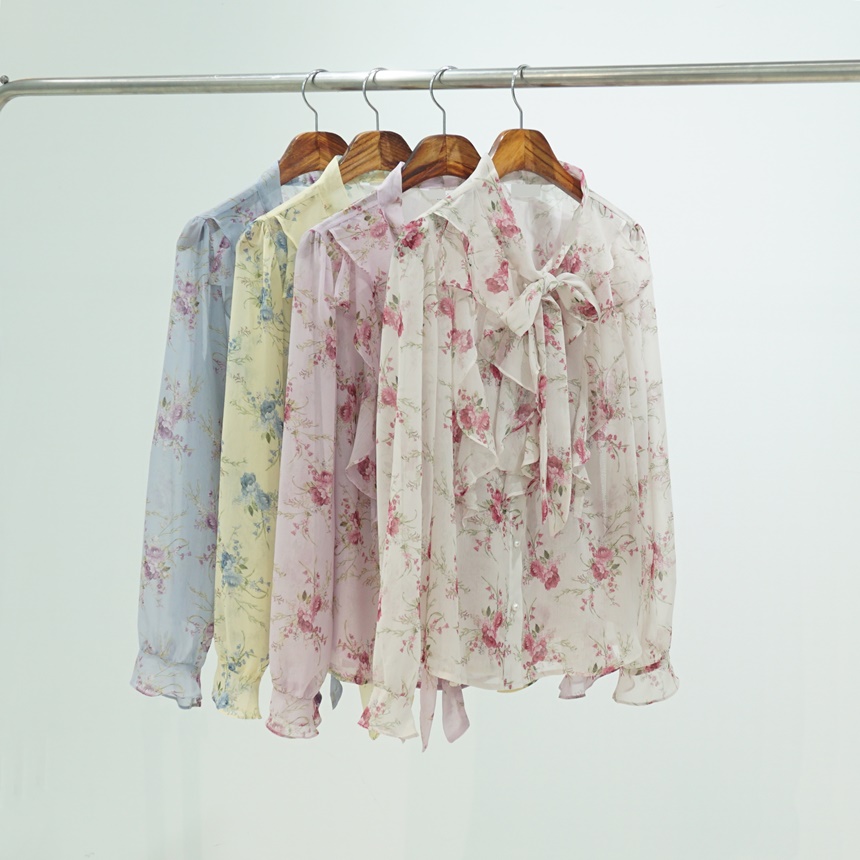 리본 타이 플라워 쉬폰 블라우스