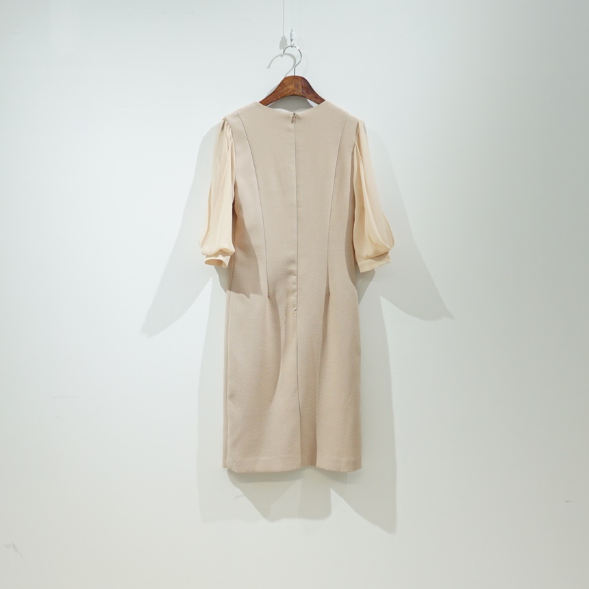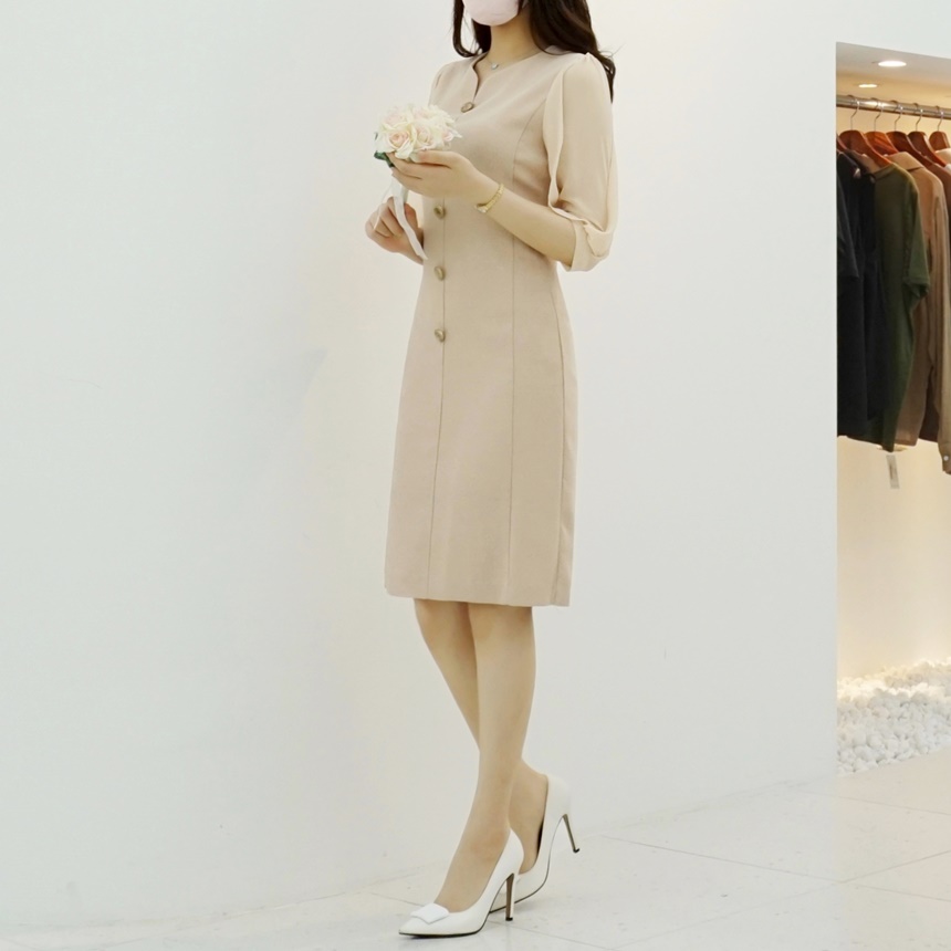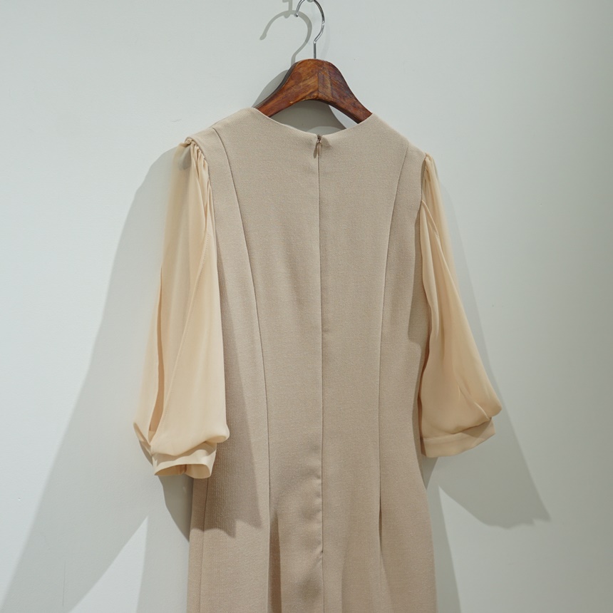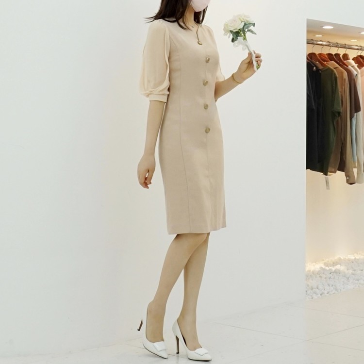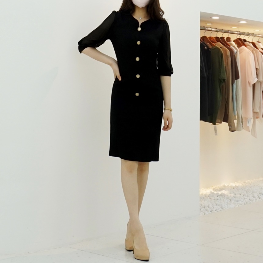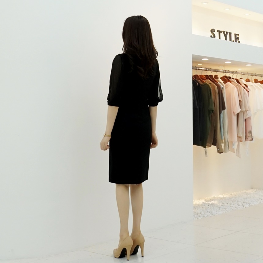 H라인 미디 하트넥 쉬폰소매 스판 정장 원피스