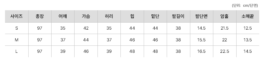 실측 사이즈 표는 단면 사이즈로