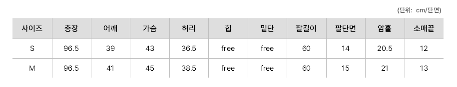 L-총장 96.5 / 어깨 43 / 가슴 47 / 허리 40.5 / 힙 free /밑단 free / 팔길이 60 / 팔단면 16 / 암홀 21.5 / 소매끝 14