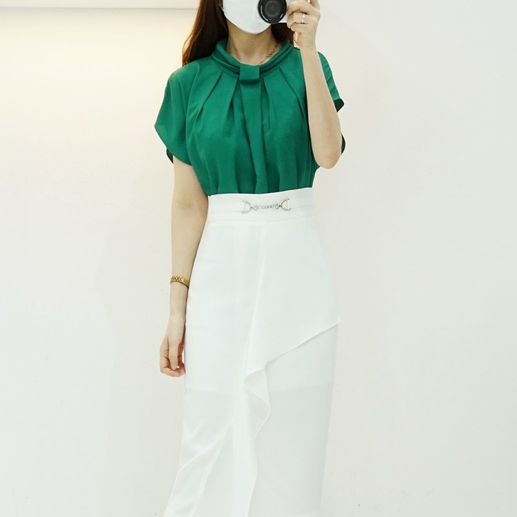 넥 라인의 내추럴한 핀턱 주름 포인트로