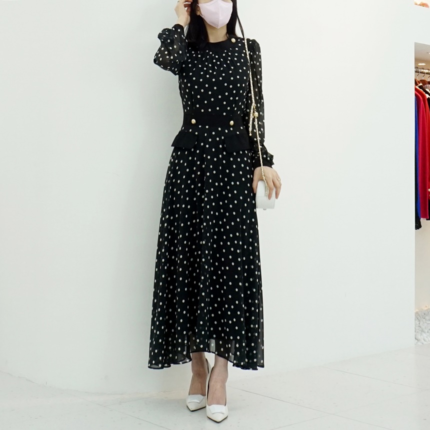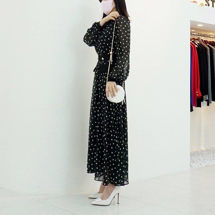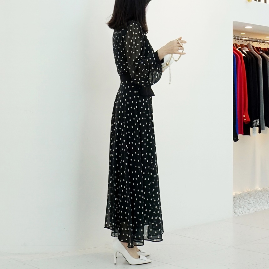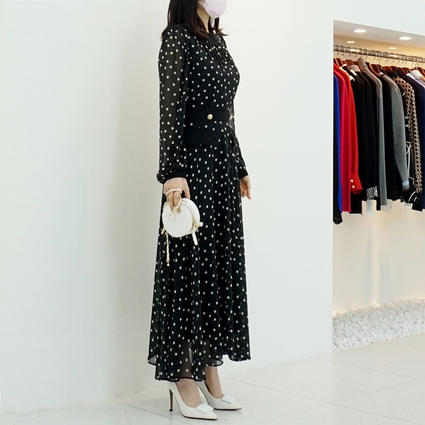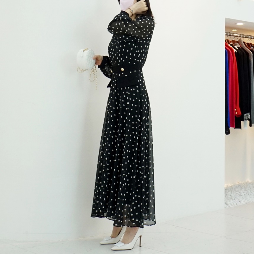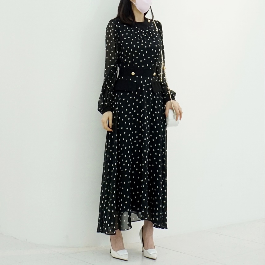 도트 쉬폰 시스루 긴팔 롱 맥시 원피스 출근룩