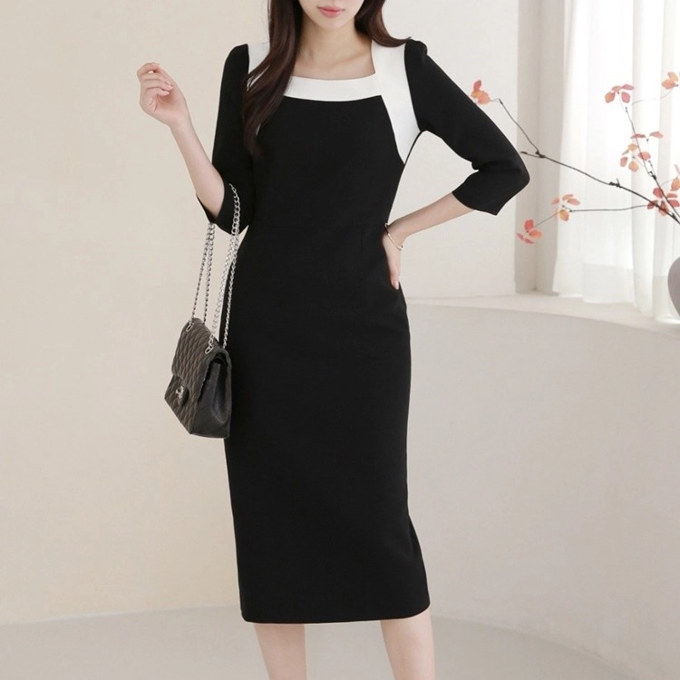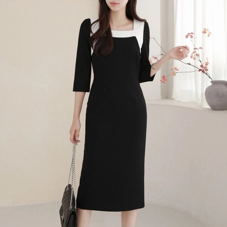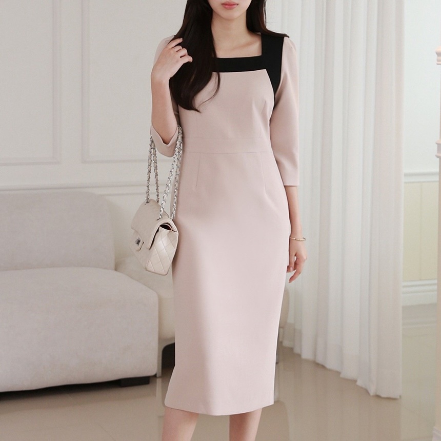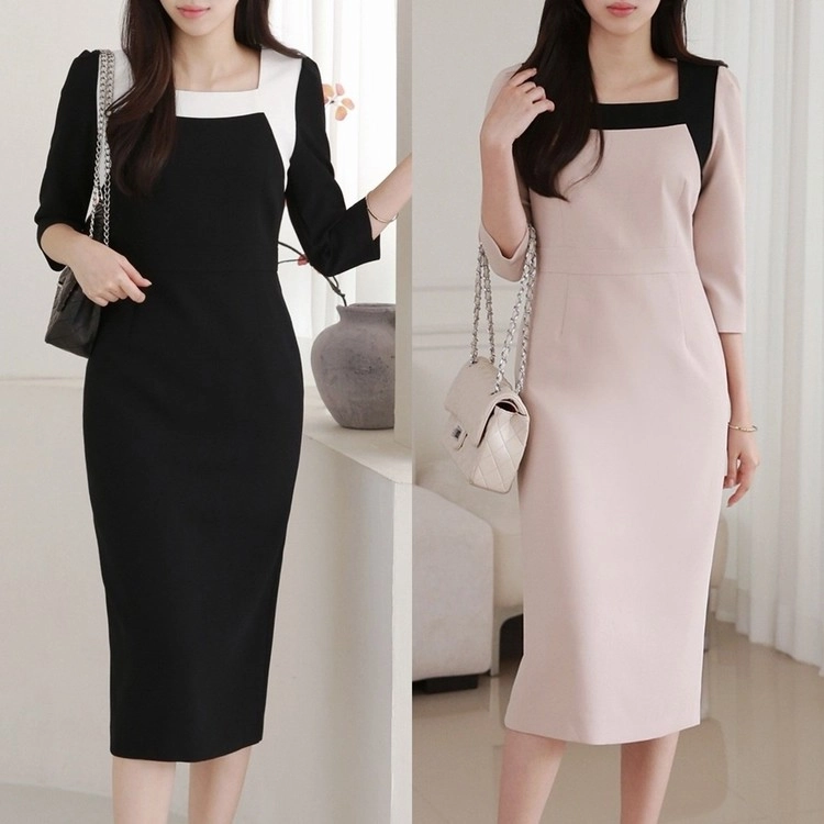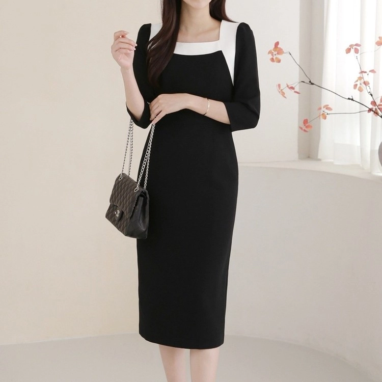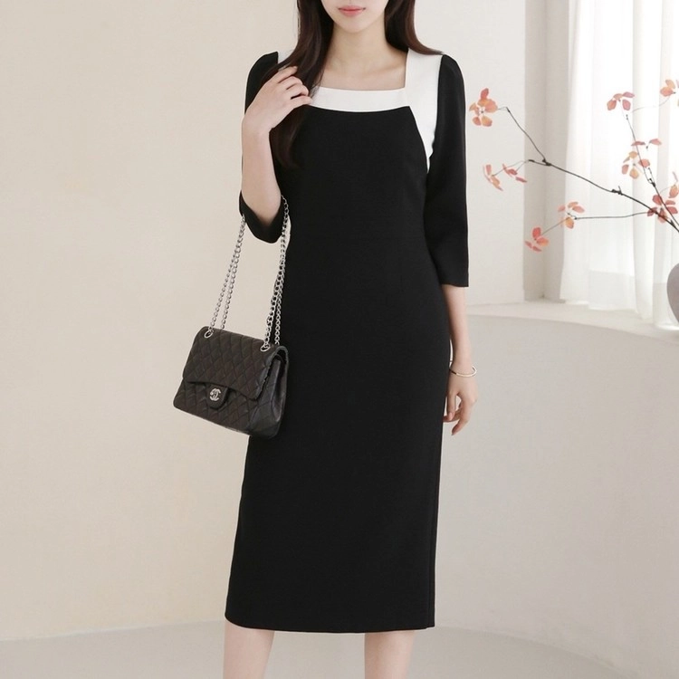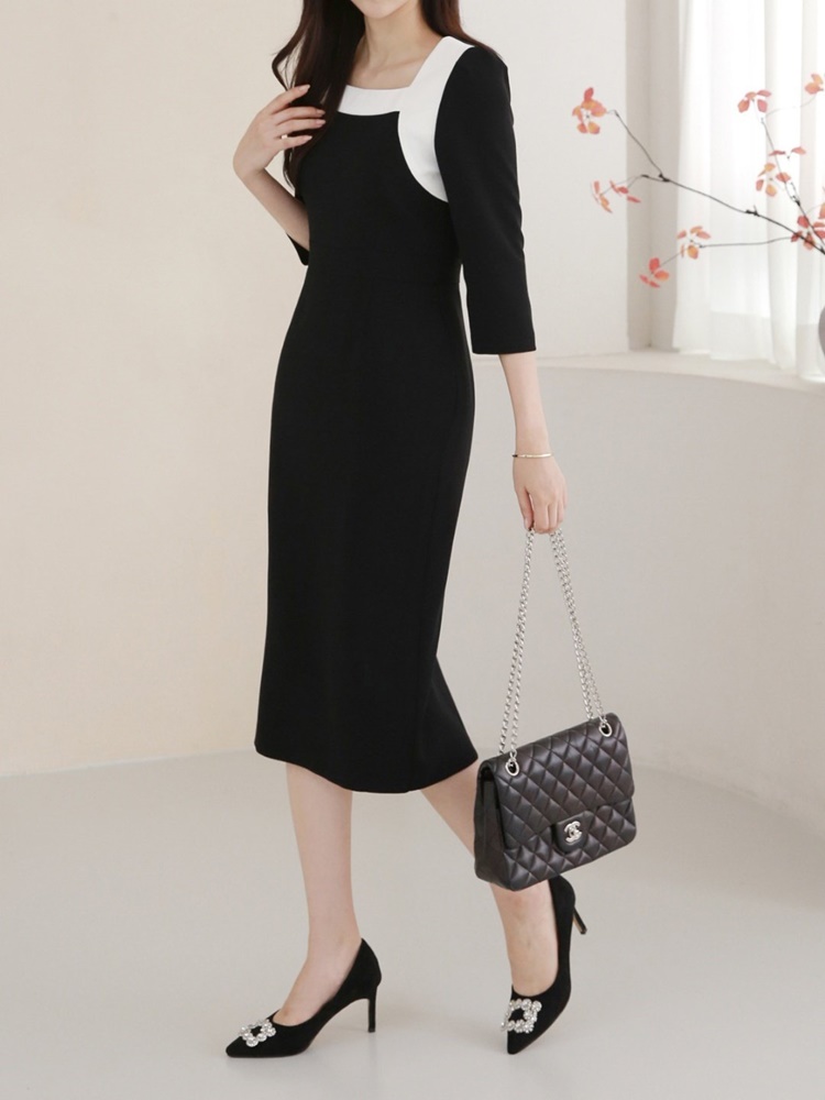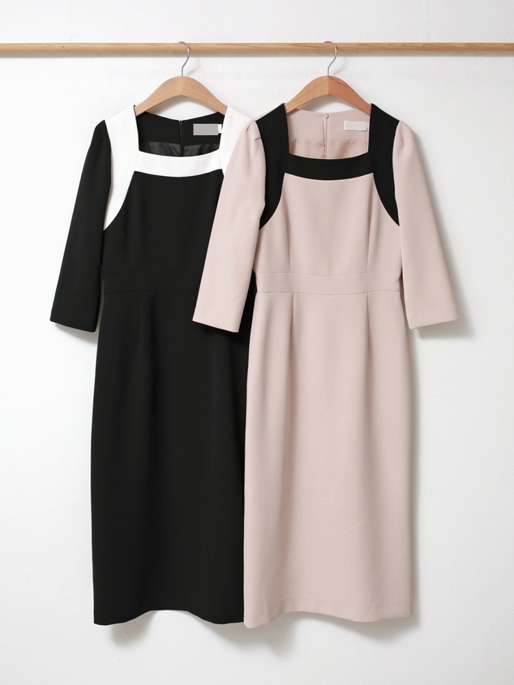 하객원피스 배색 스퀘어넥 H라인 정장 원피스