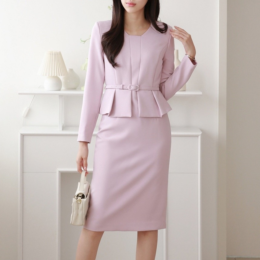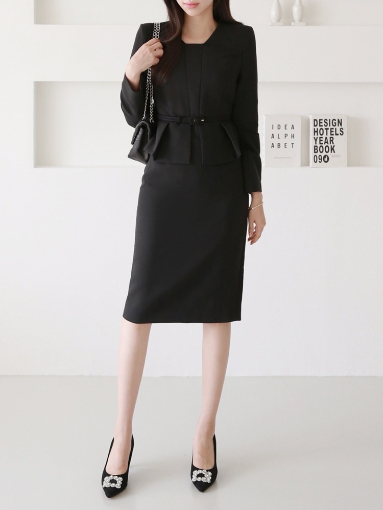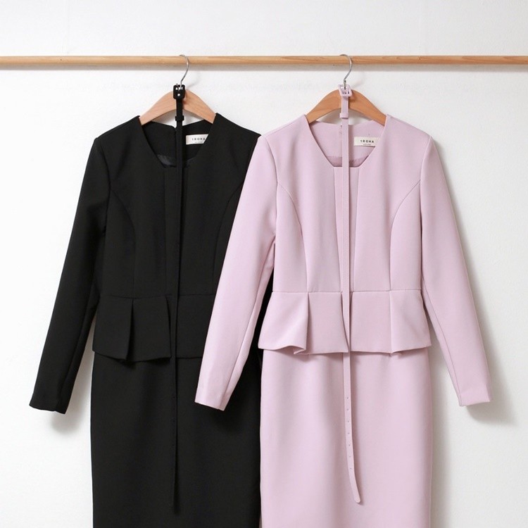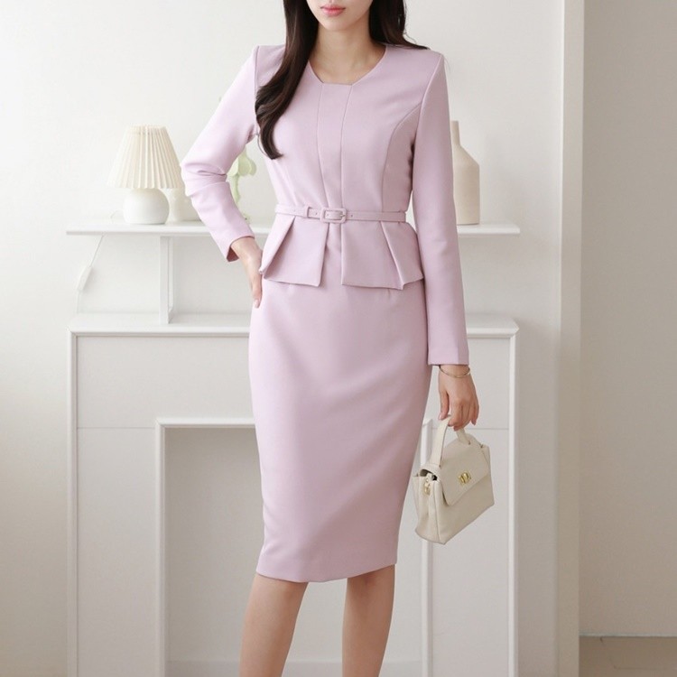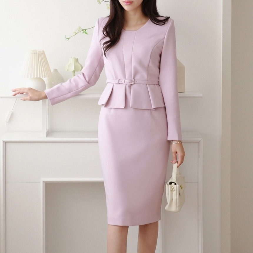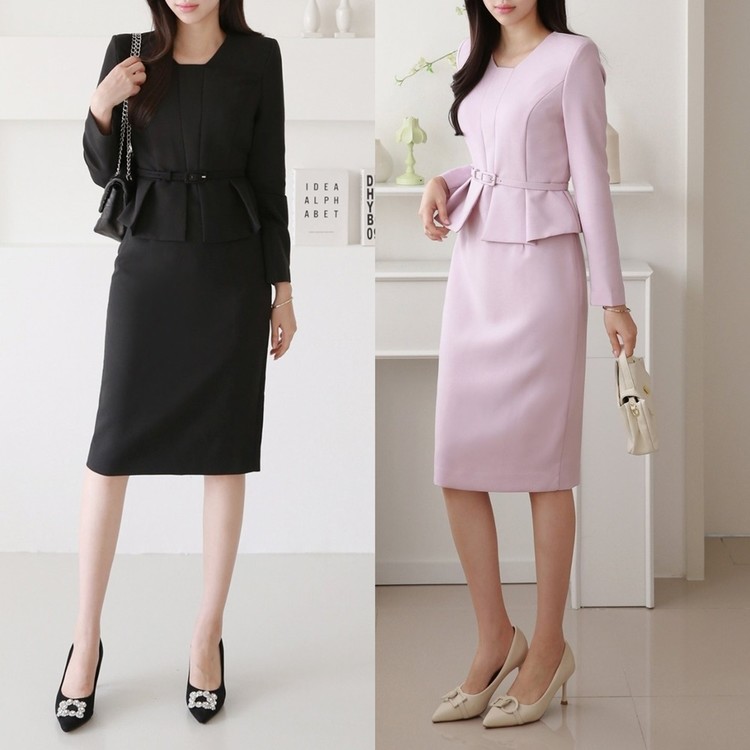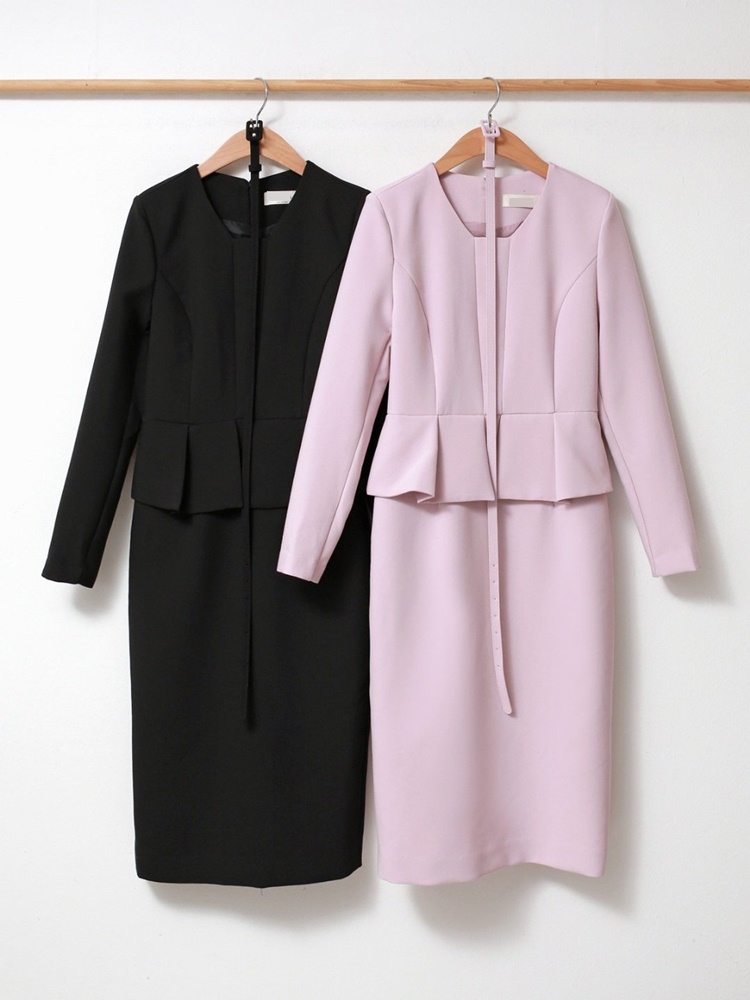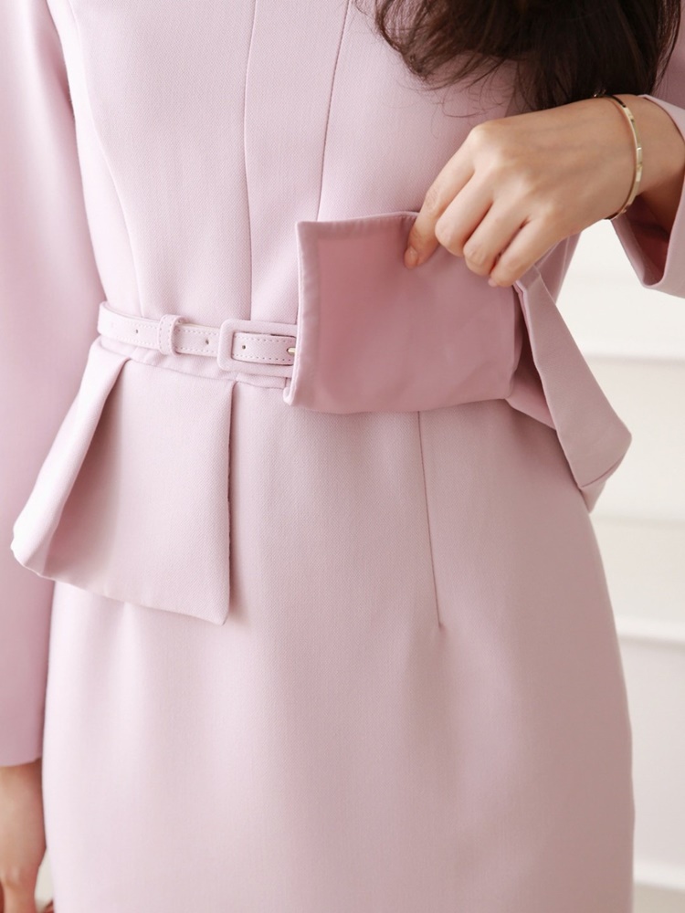 벨티드 핀턱 페플럼 H라인 미디 정장 원피스