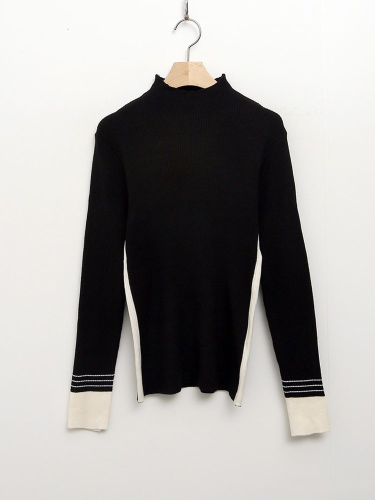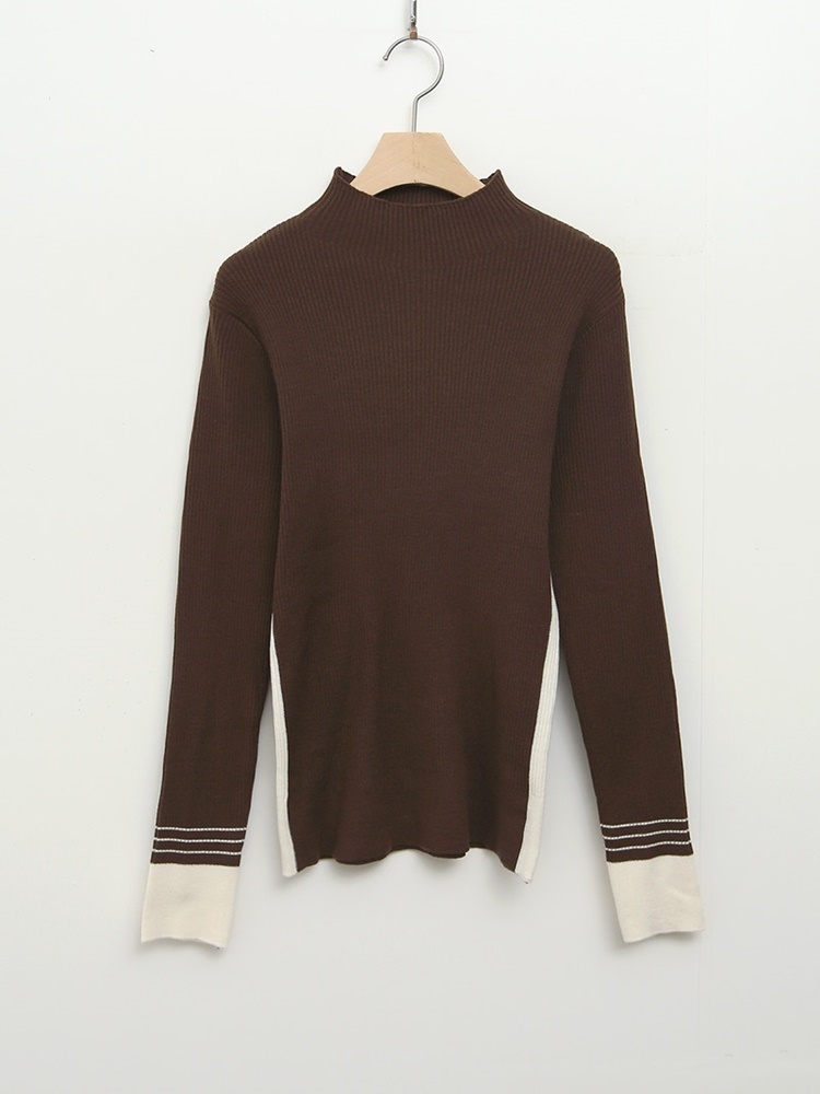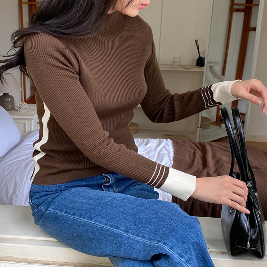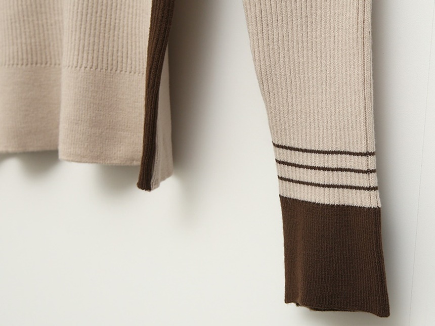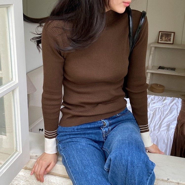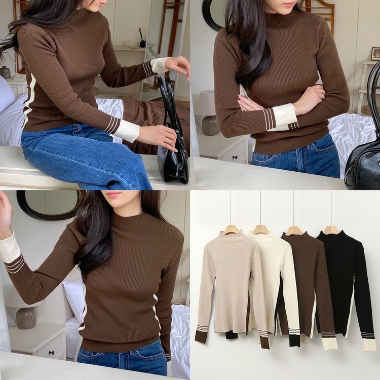 배색 포인트 긴팔 니트 티셔츠 출근패션
