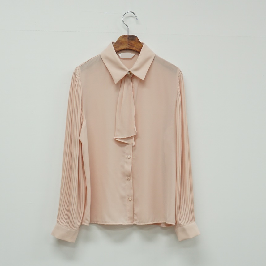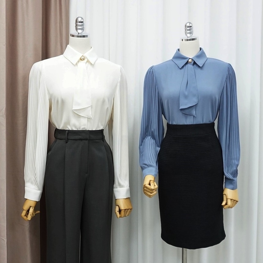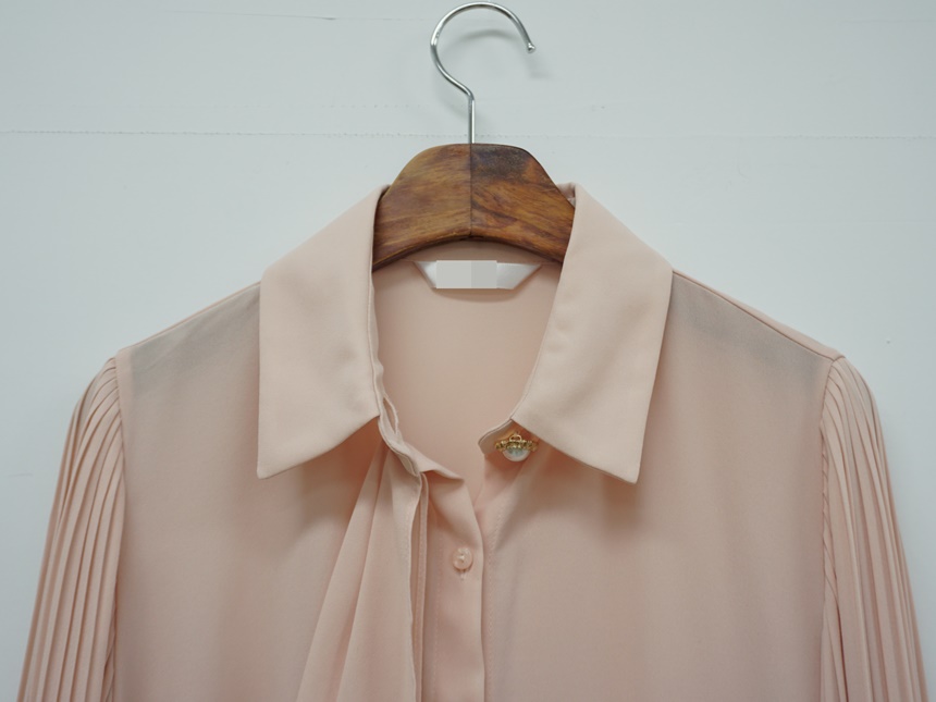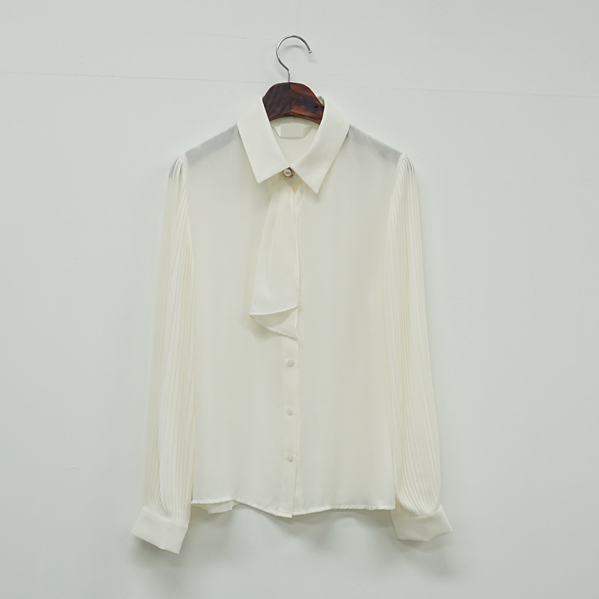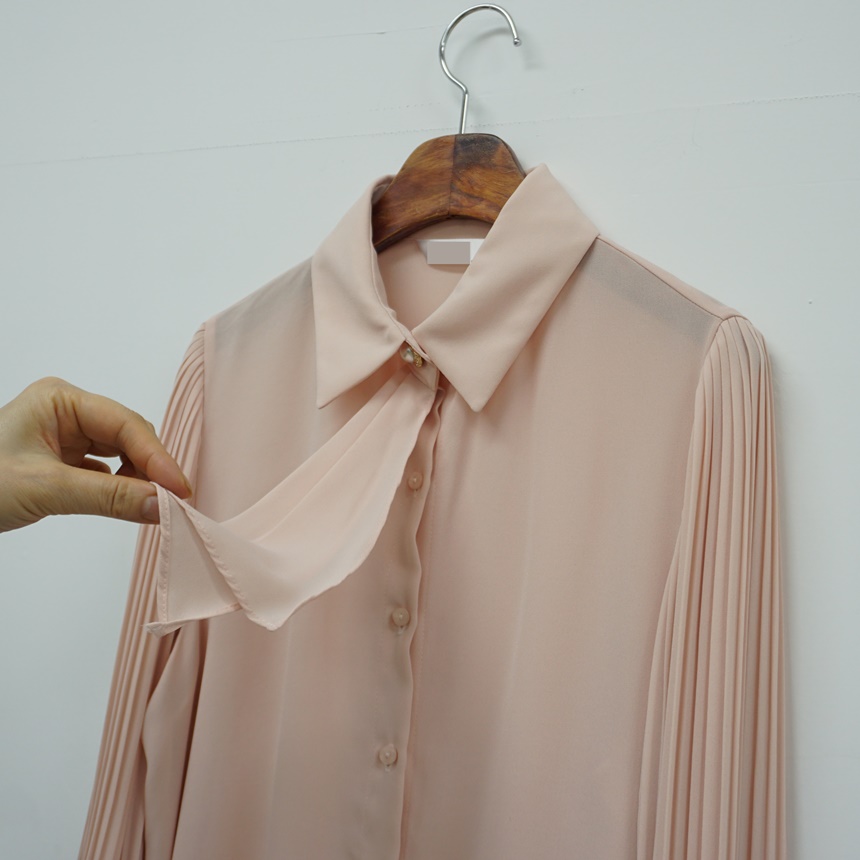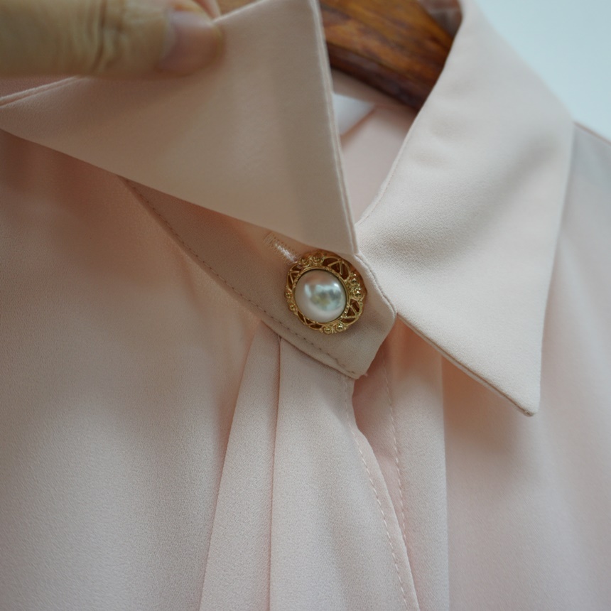 우아한 진주버튼 카라넥 소매 주름 쉬폰 블라우스