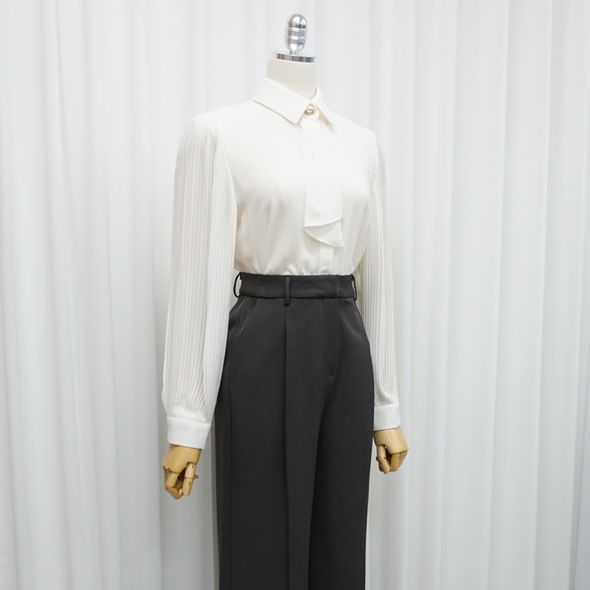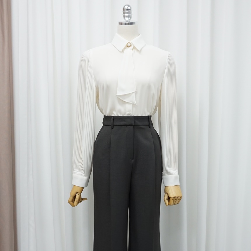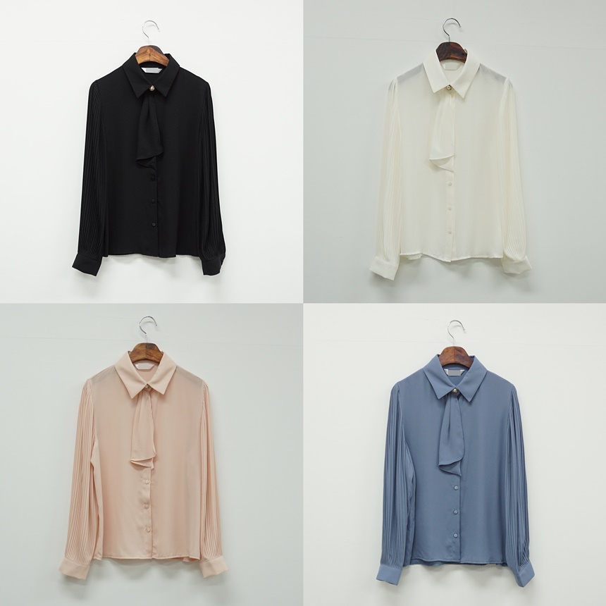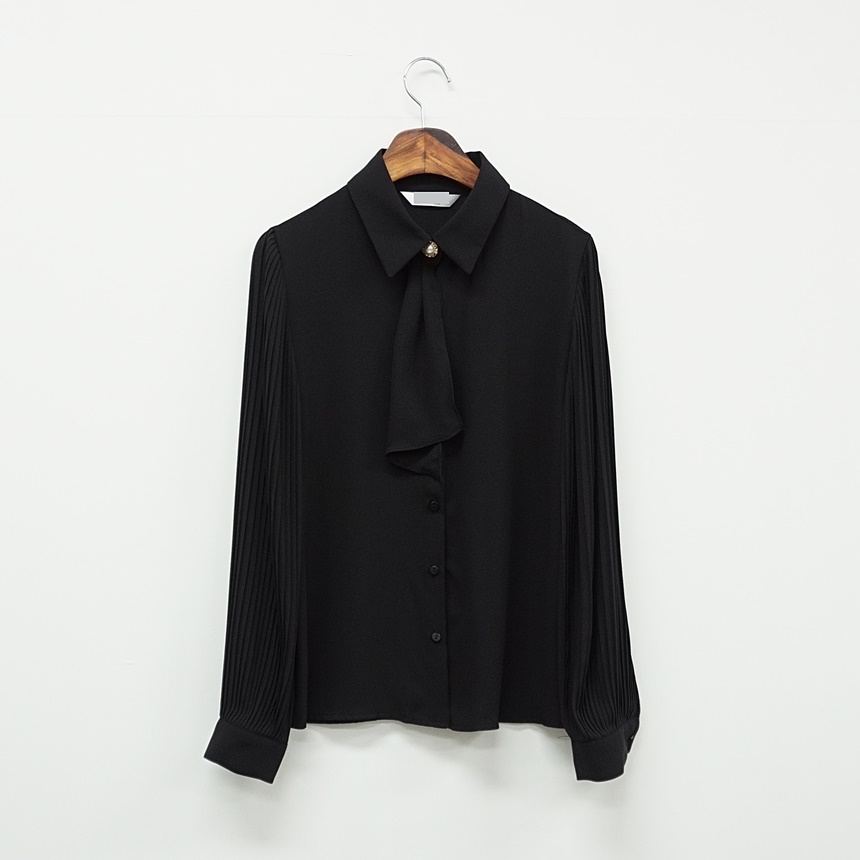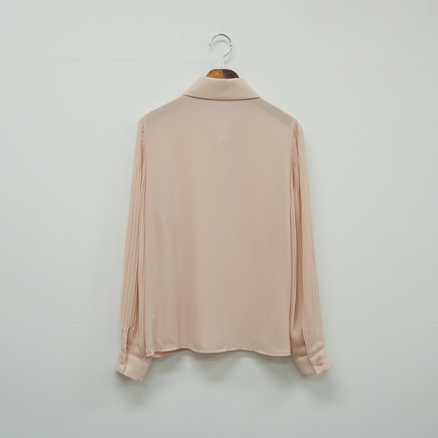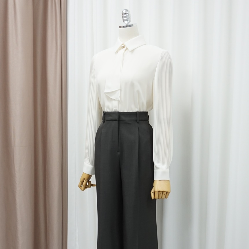 우아한 진주버튼 카라넥 소매 주름 쉬폰 블라우스