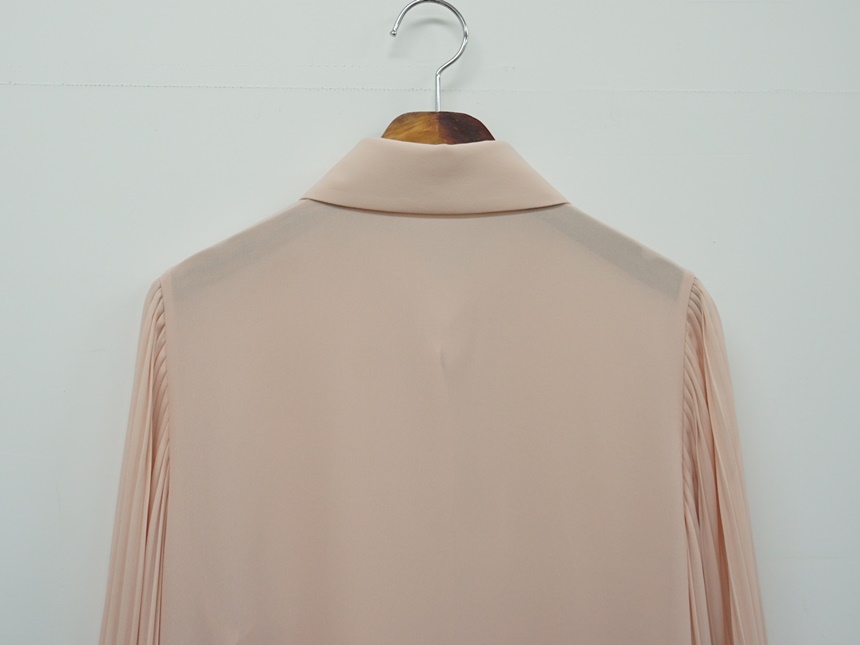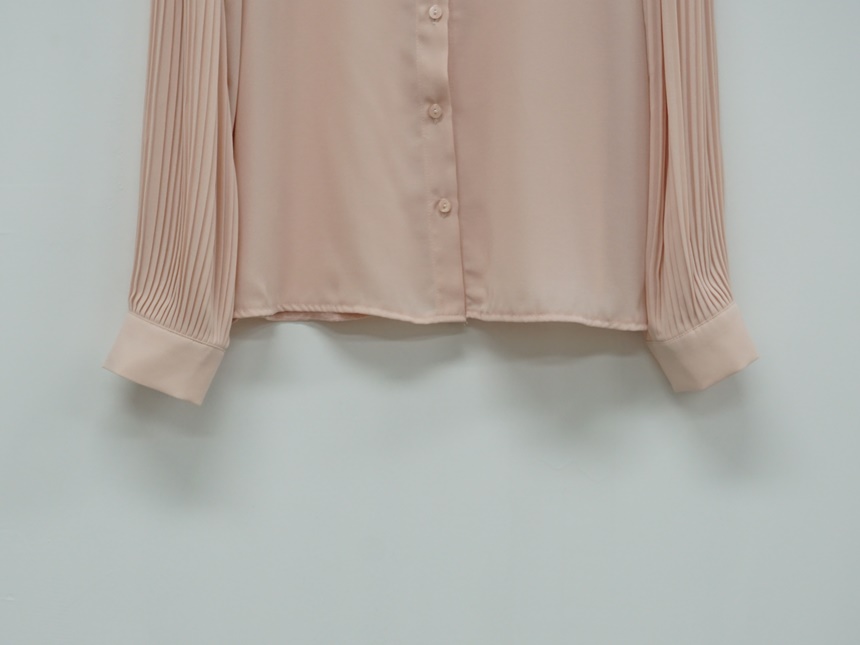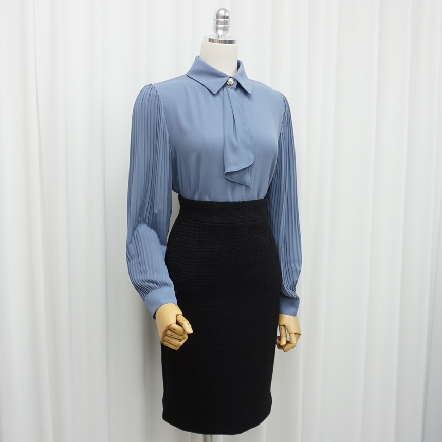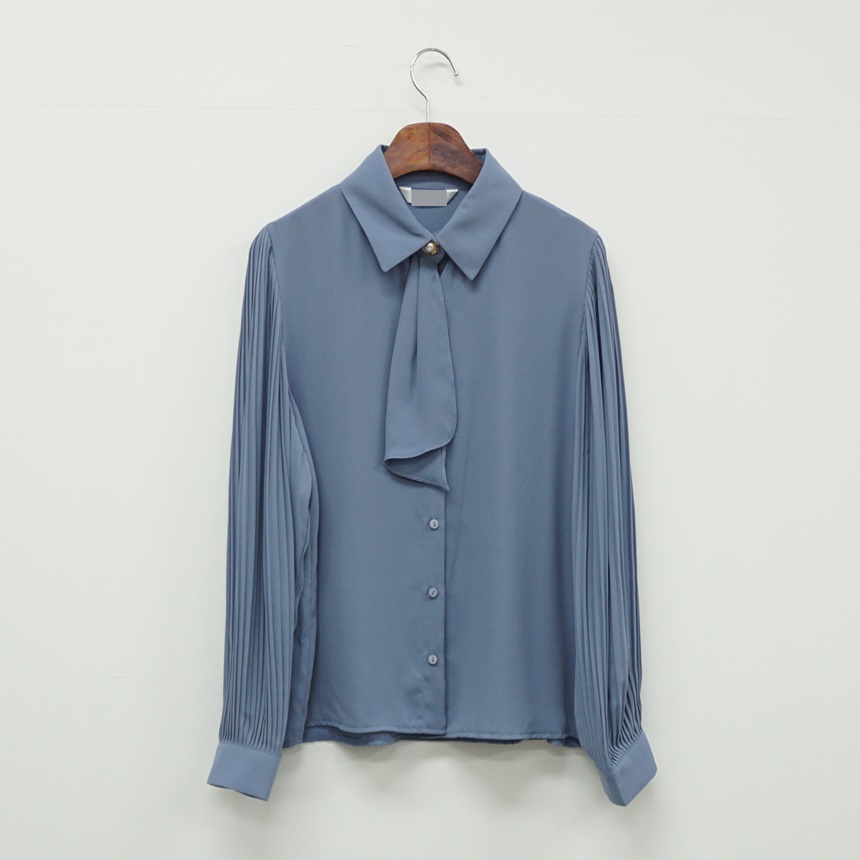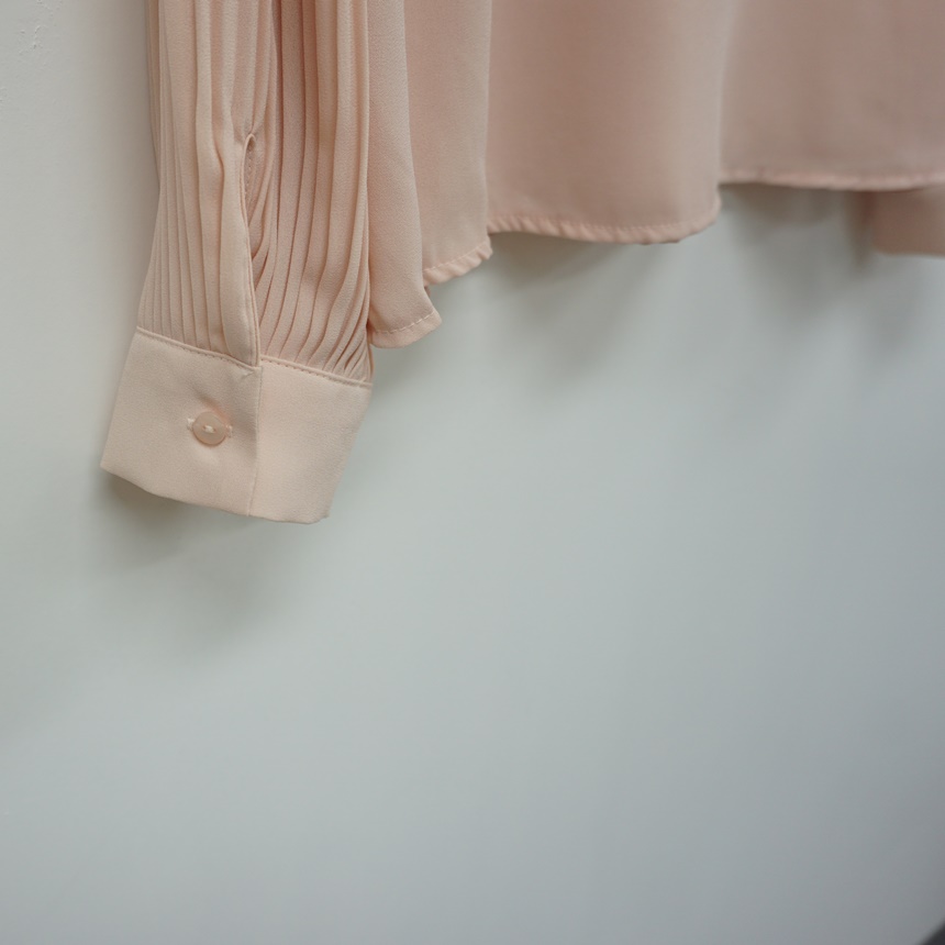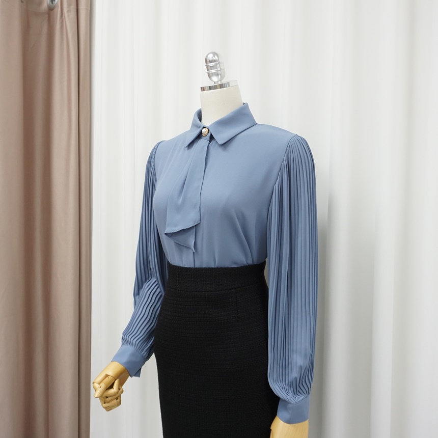 우아한 진주버튼 카라넥 소매 주름 쉬폰 블라우스