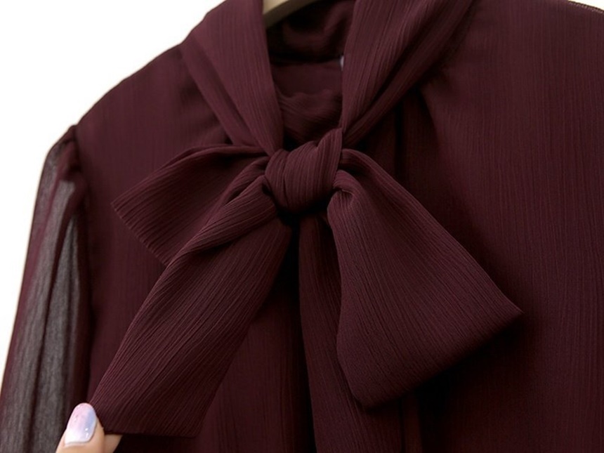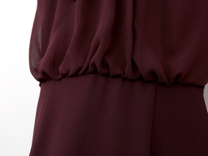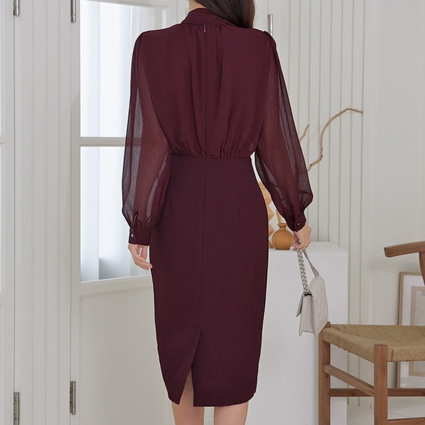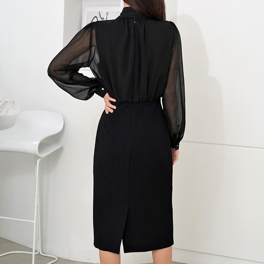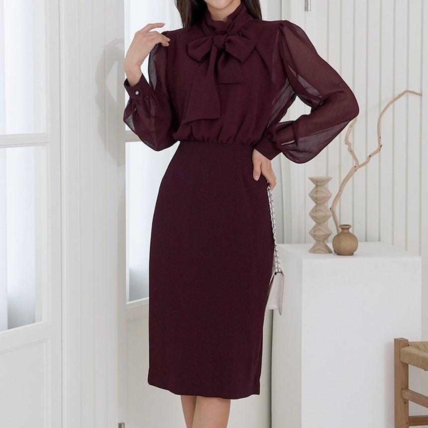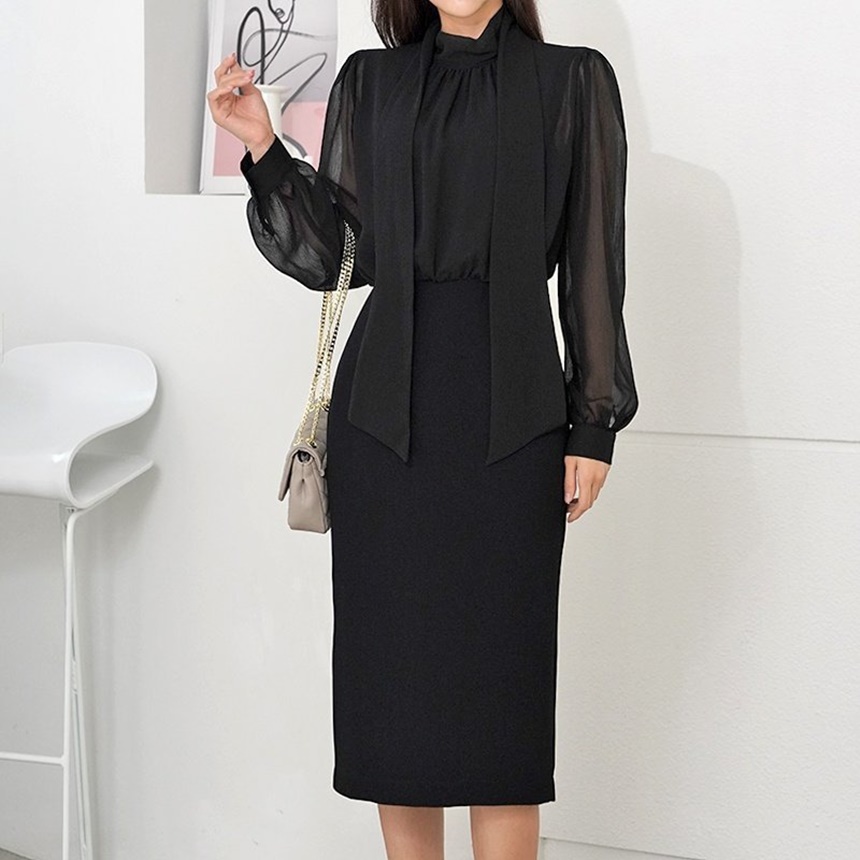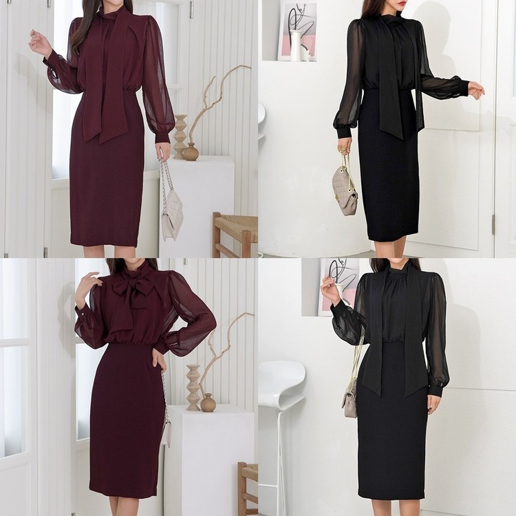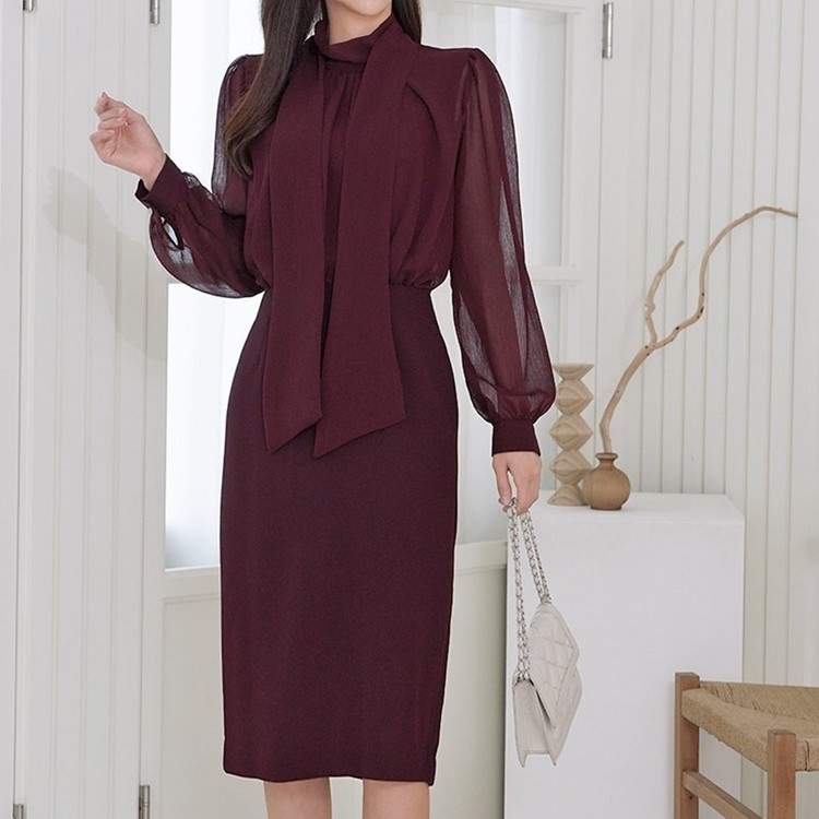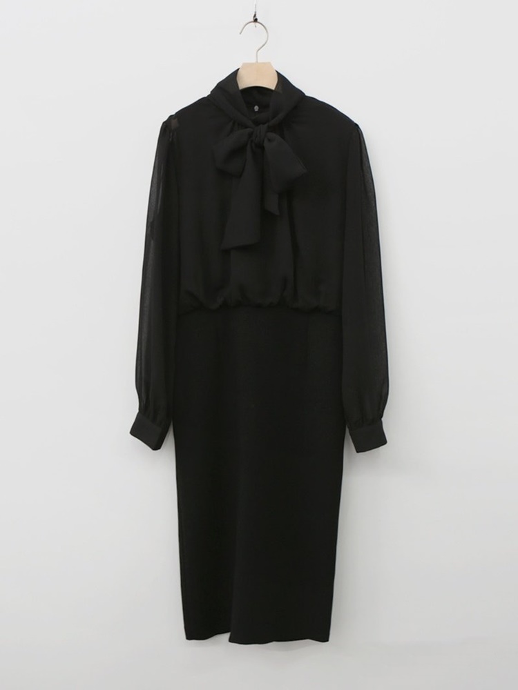 쉬폰 스카프 하이넥 시스루 H라인 미디 원피스