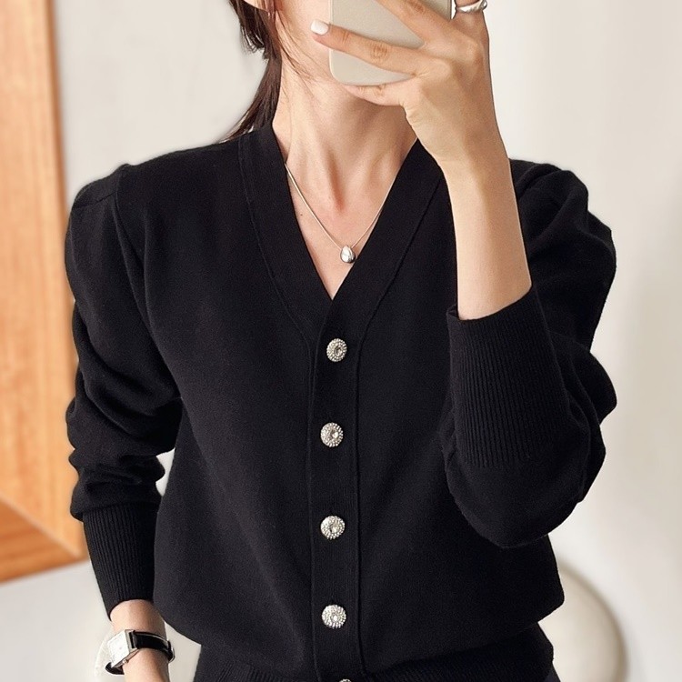 보석단추 브이넥 어깨 퍼프 가디건 출근룩