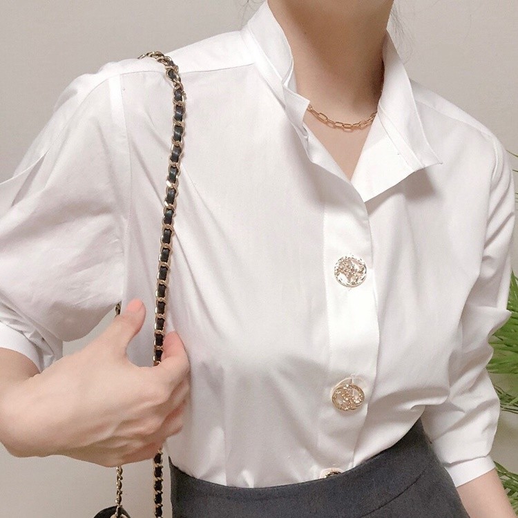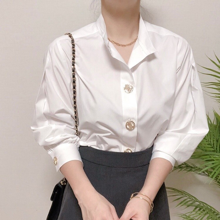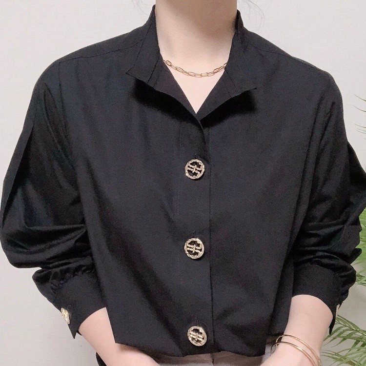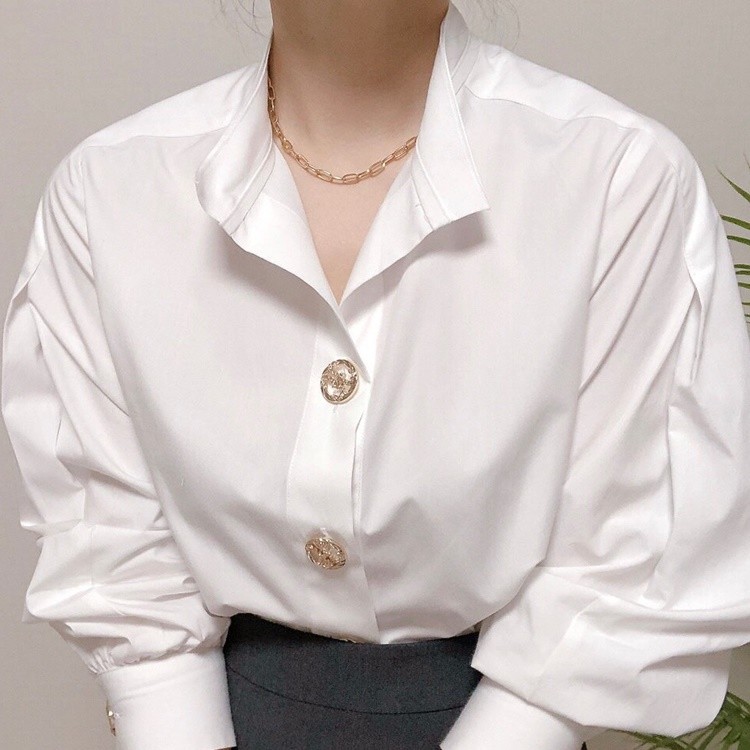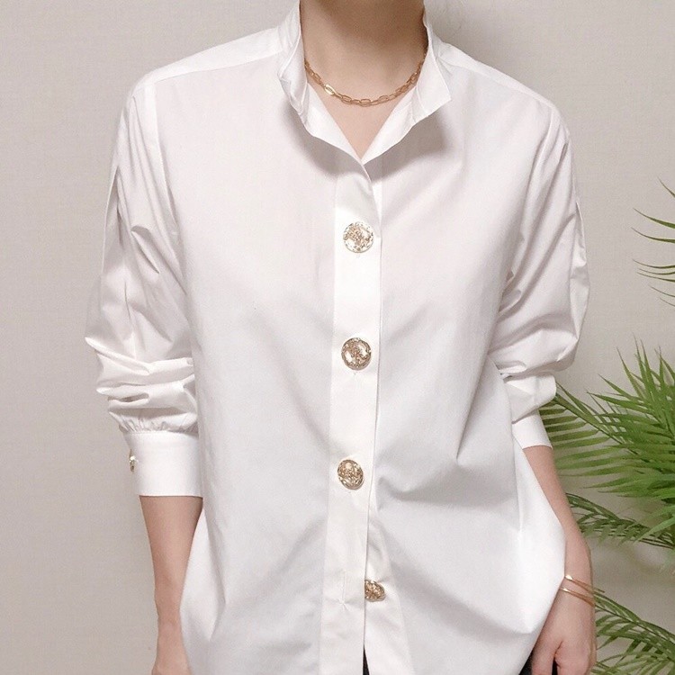 고급스러운 스탠카라 금장버튼 코튼 블라우스