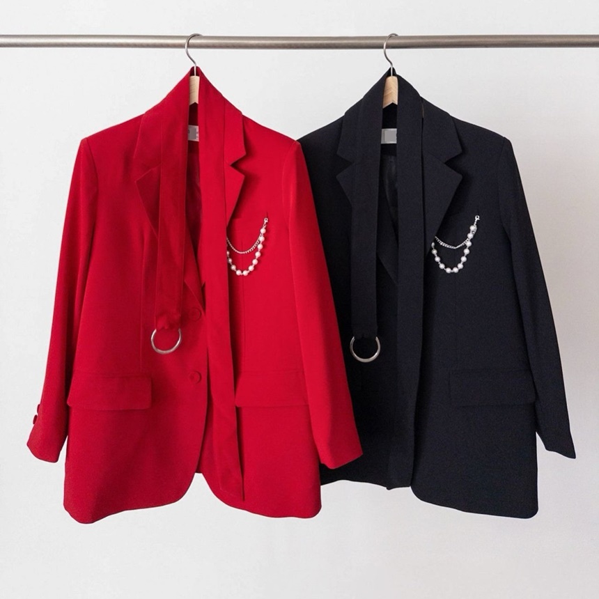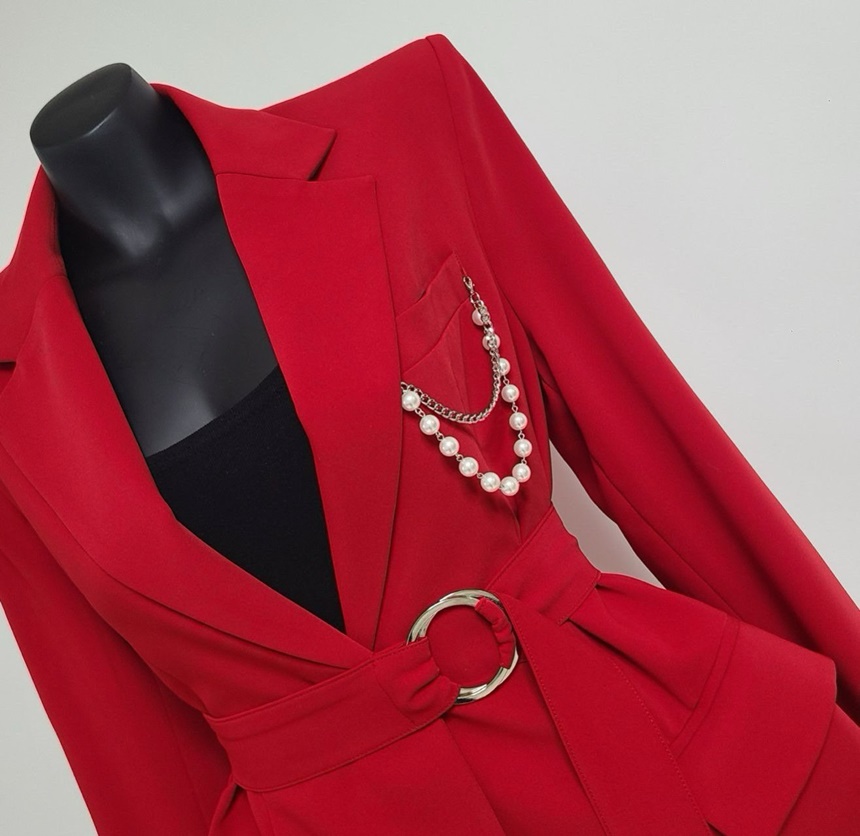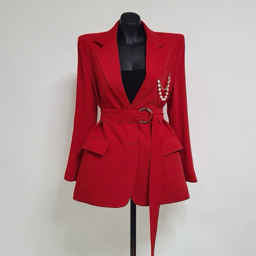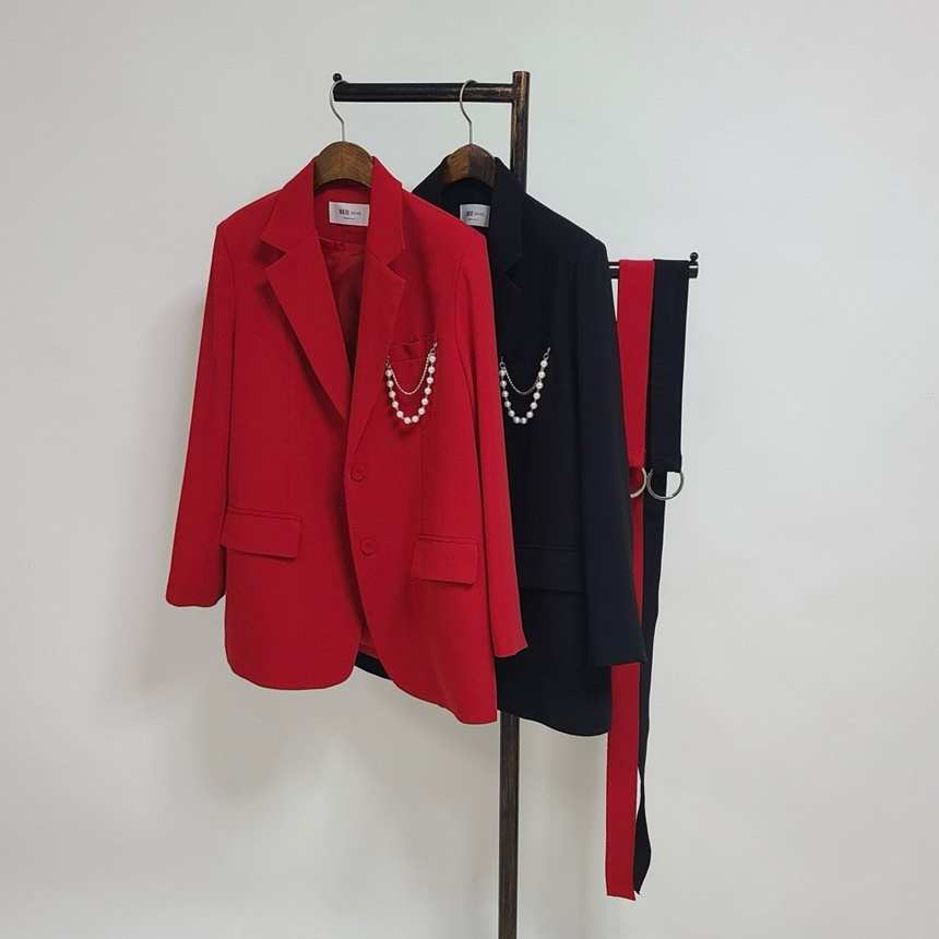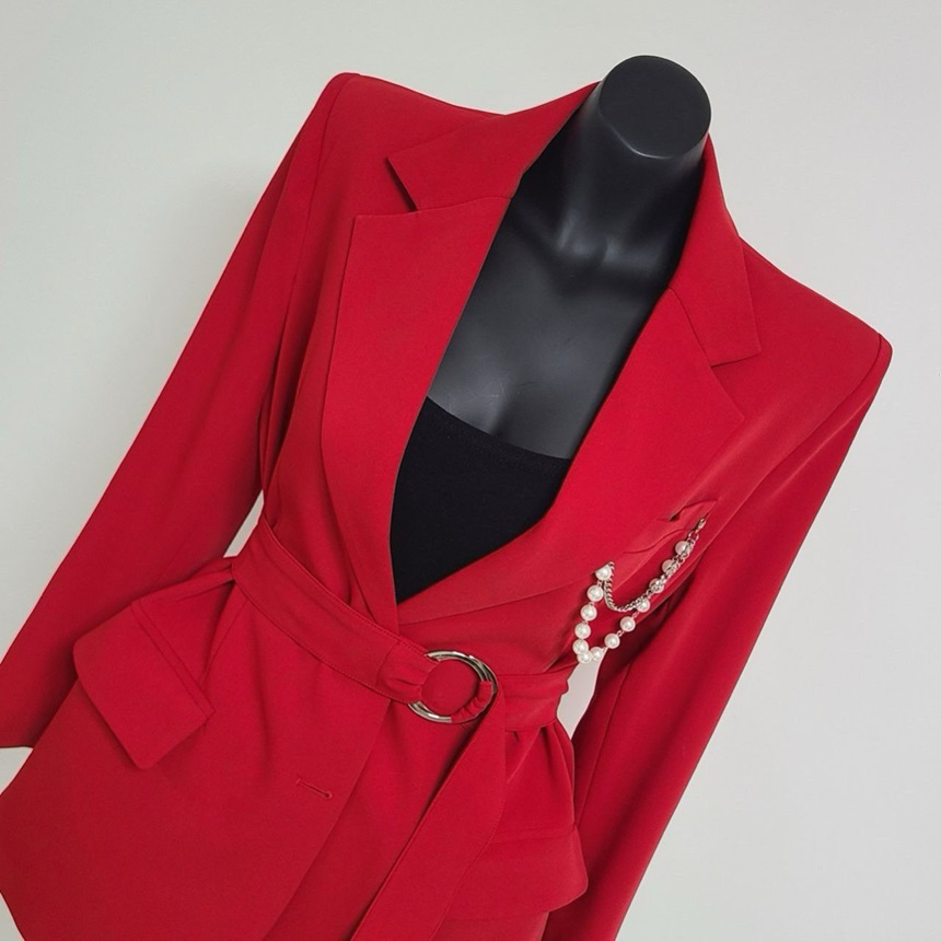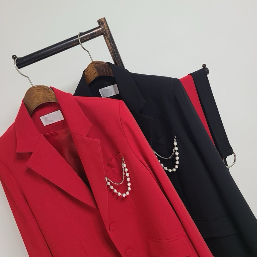 시크감성 벨티드 진주장식 브로치 뒤트임 자켓