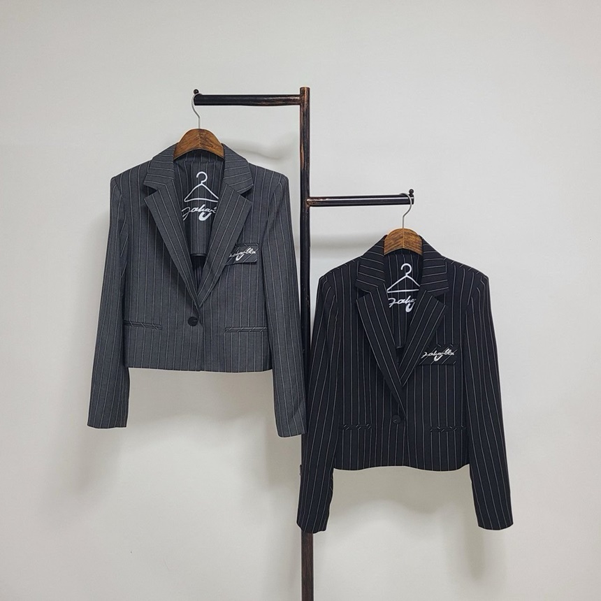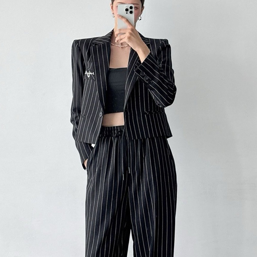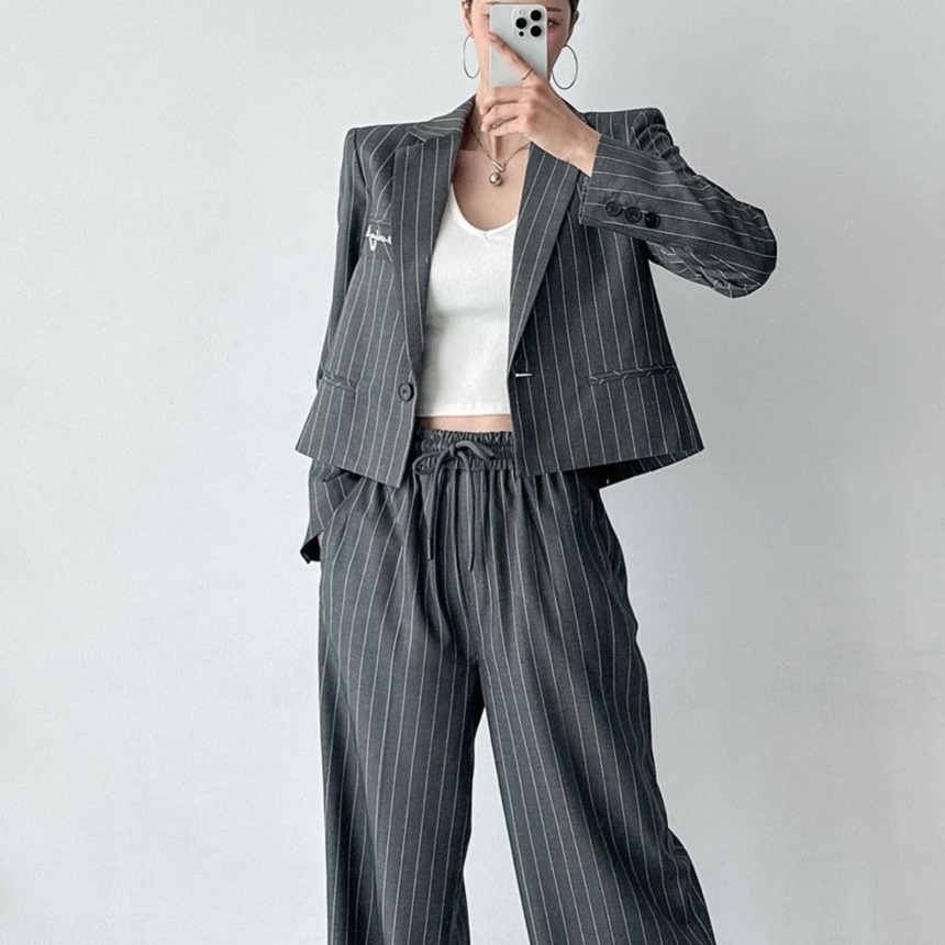 유니크 스트라이프 크롭 자켓 출근룩 코디