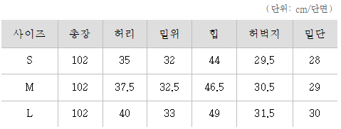 실측 사이즈 표는 단면 사이즈로