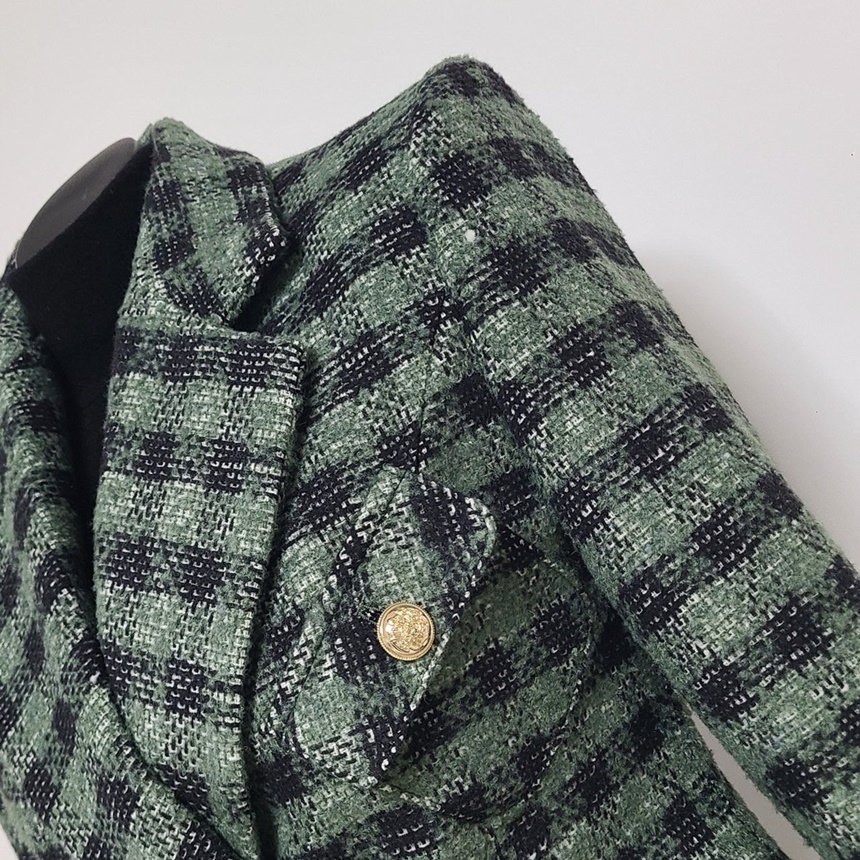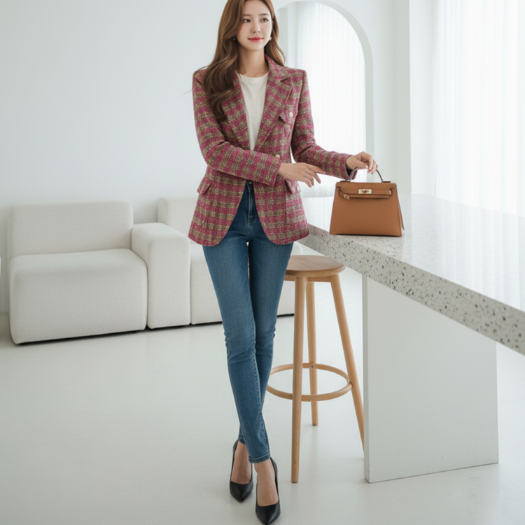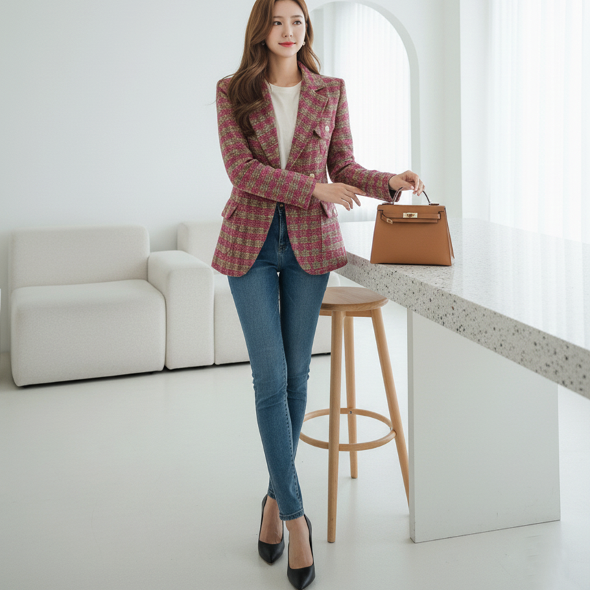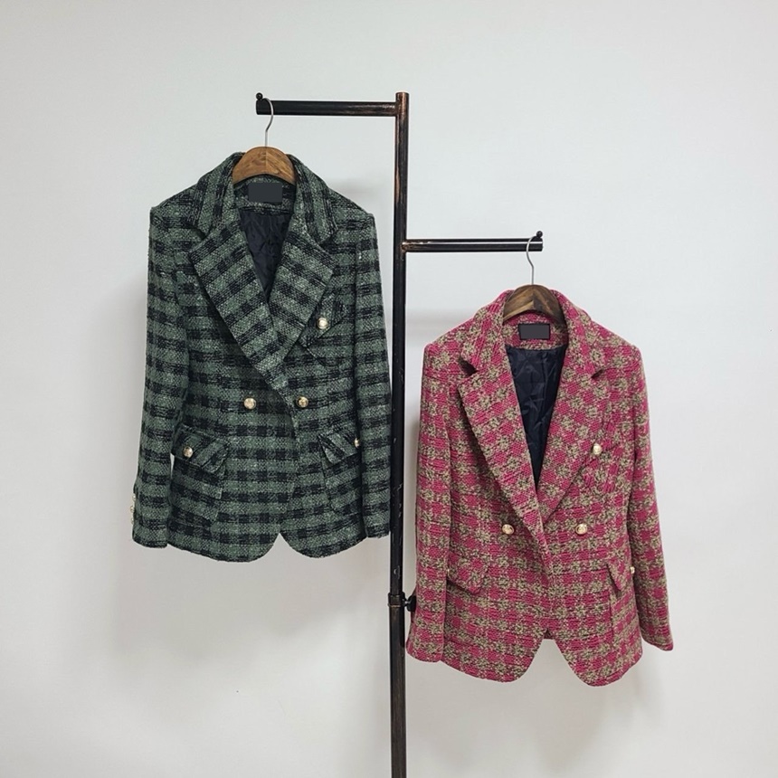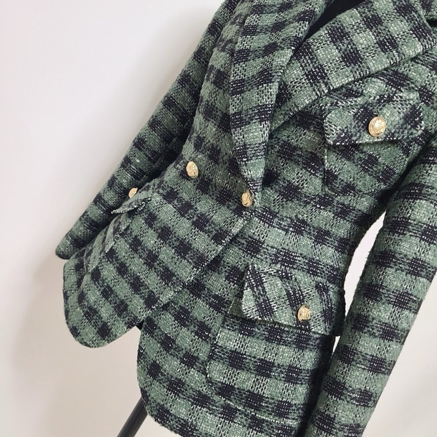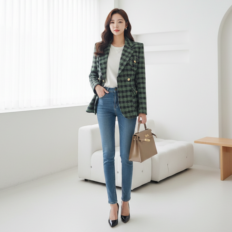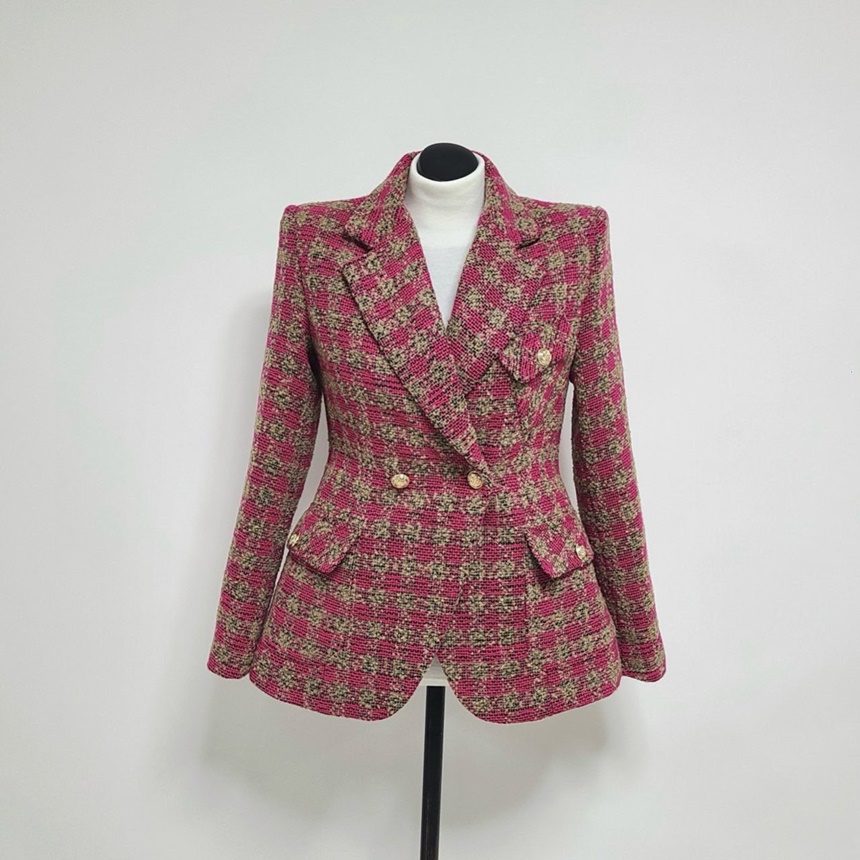 세련된 가슴 사이드 플랩 포켓 체크 자켓