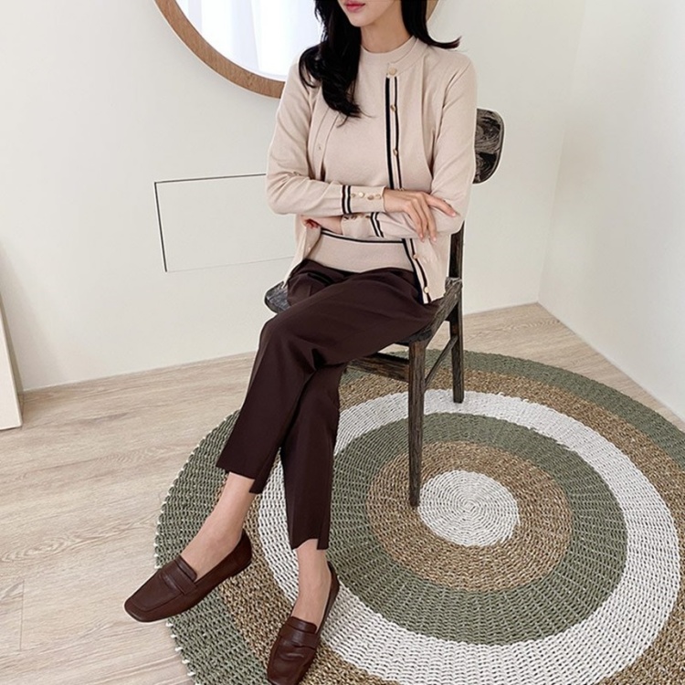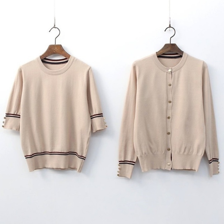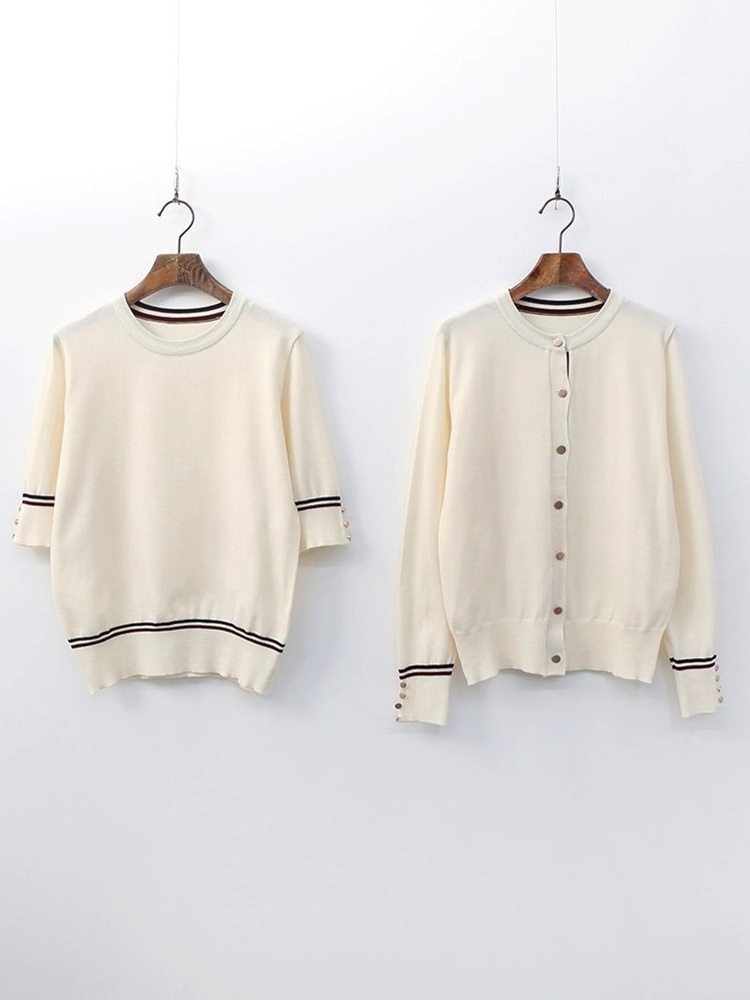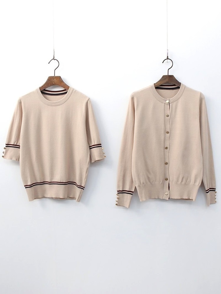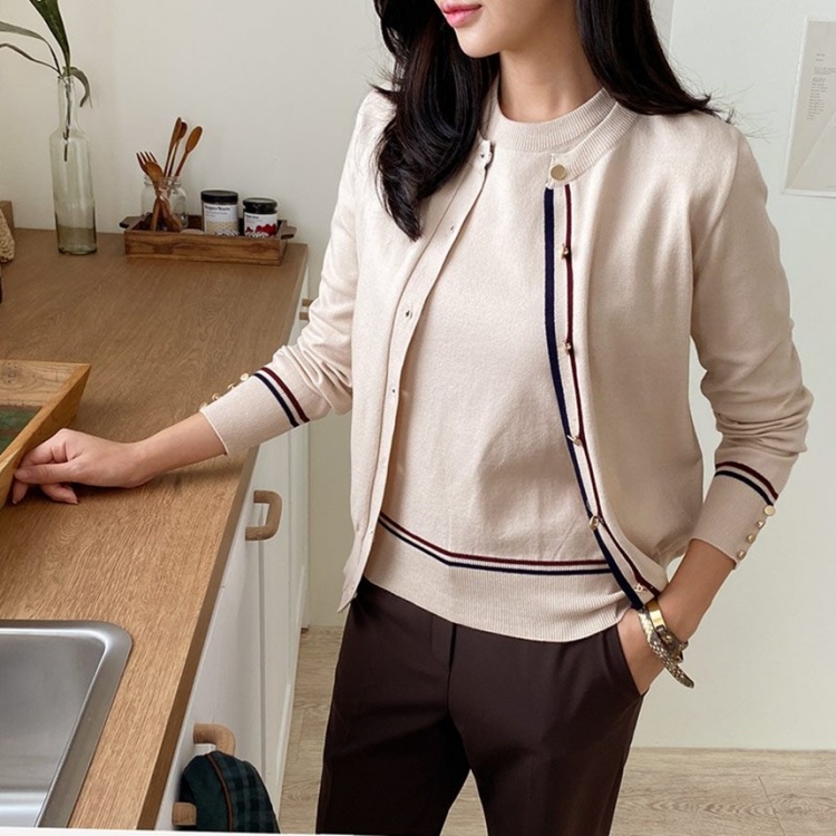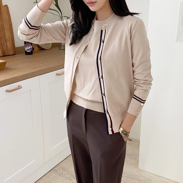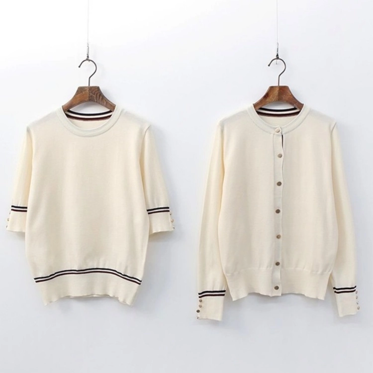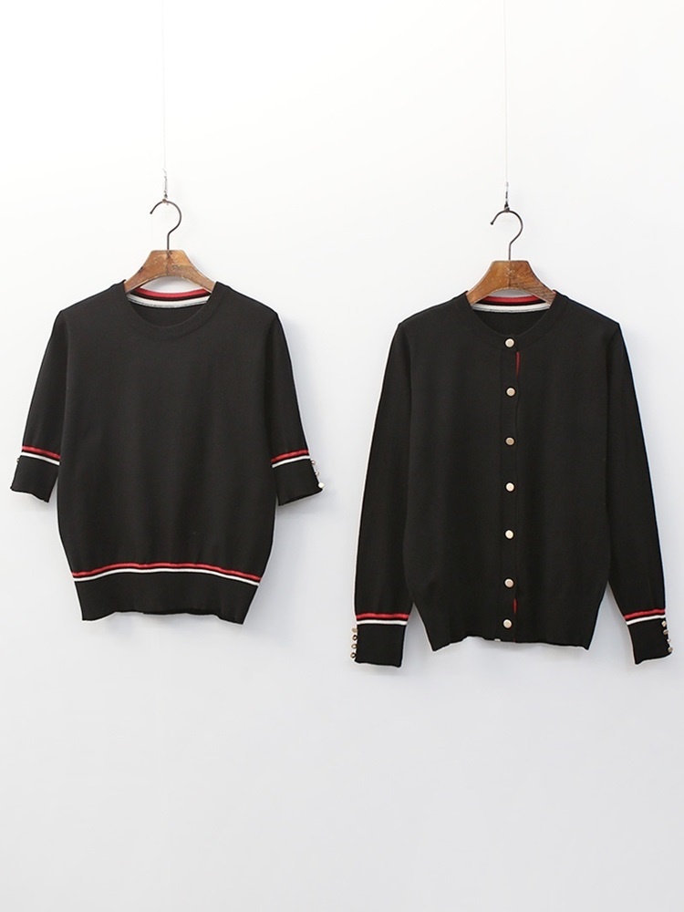 여성 투톤 배색 라운드 반팔 니트 티셔츠 가디건 세트