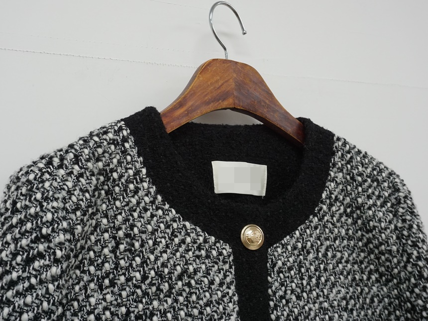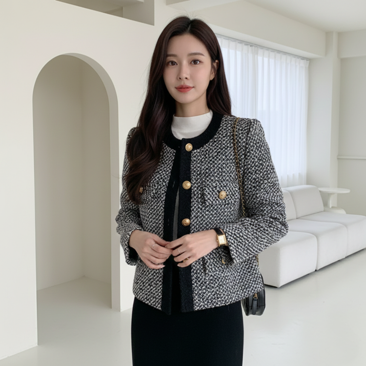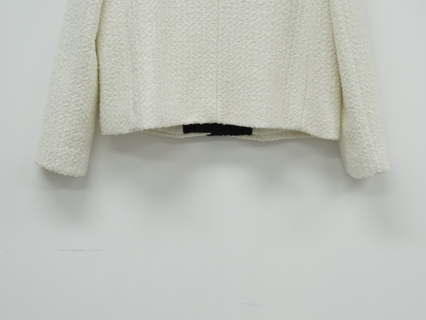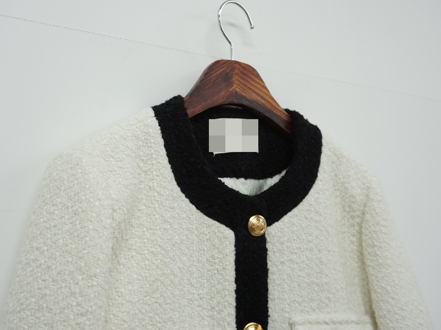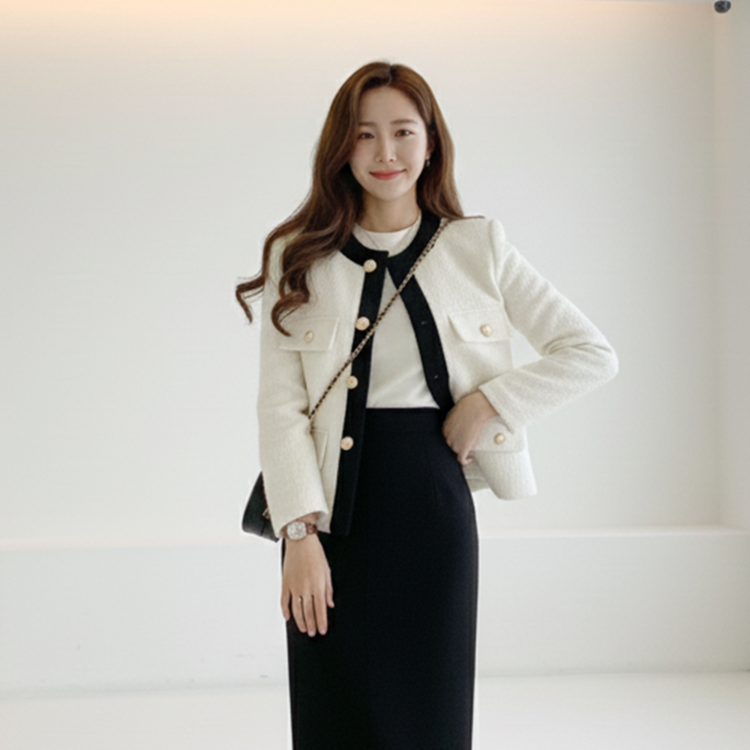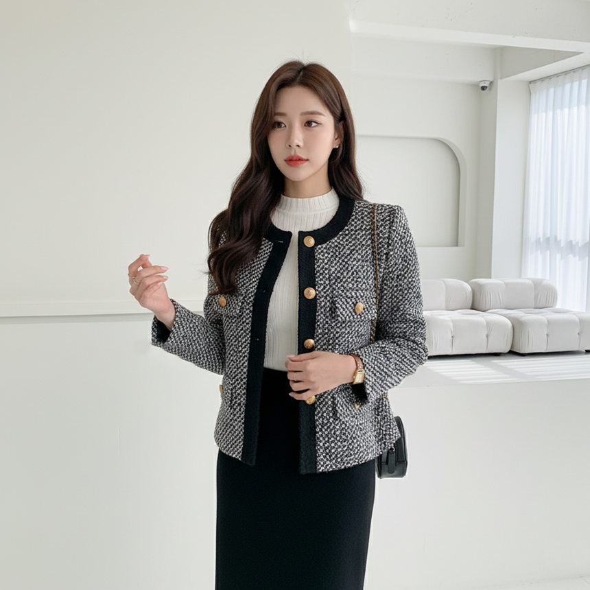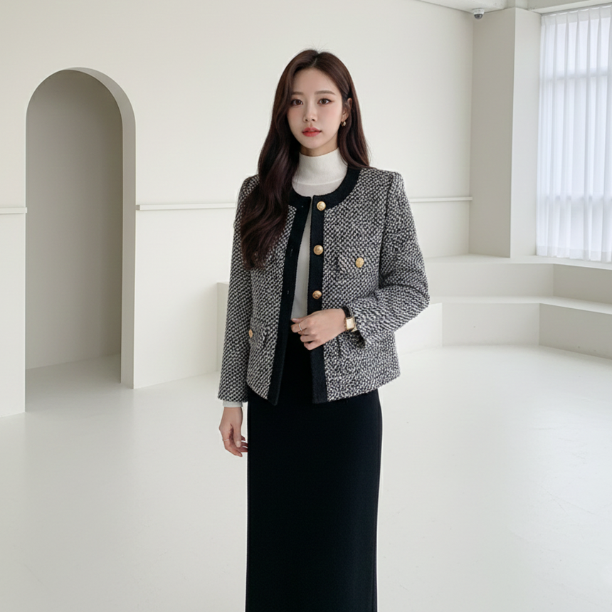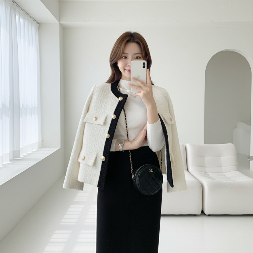 배색 콤비 라운드넥 울 트위드 자켓