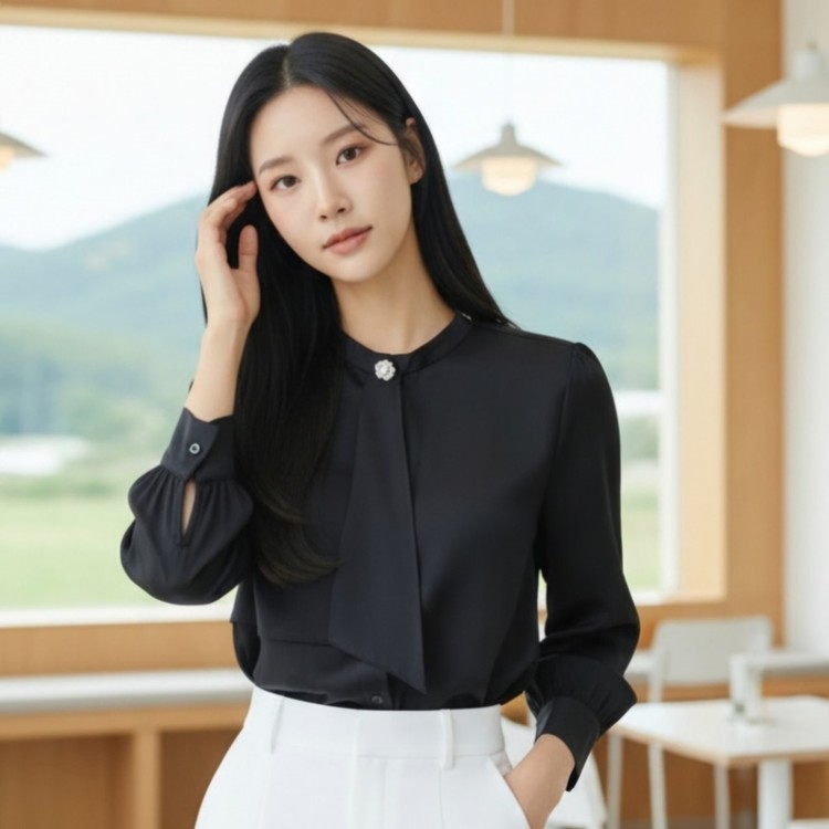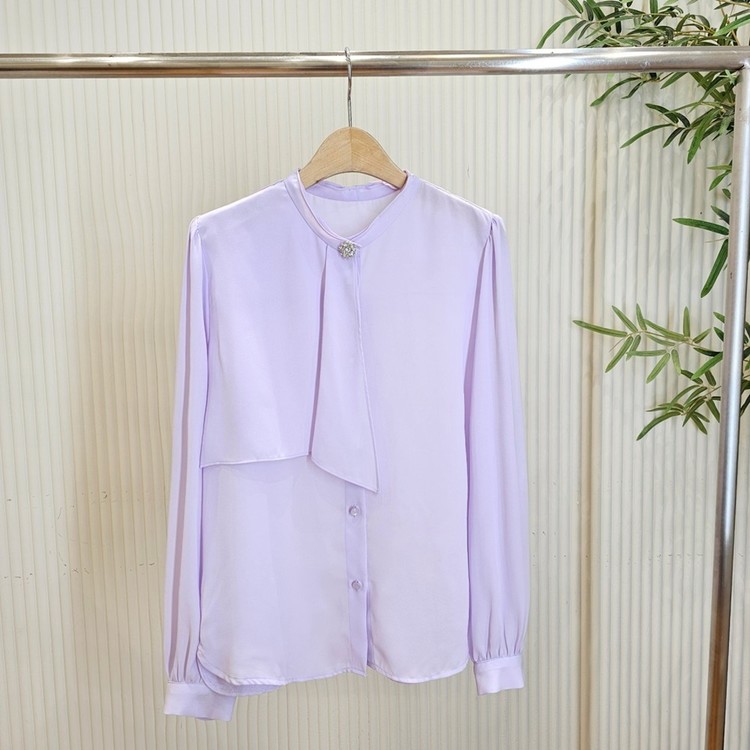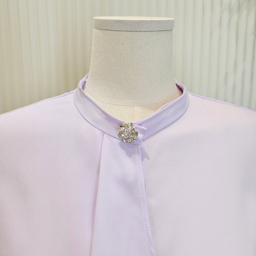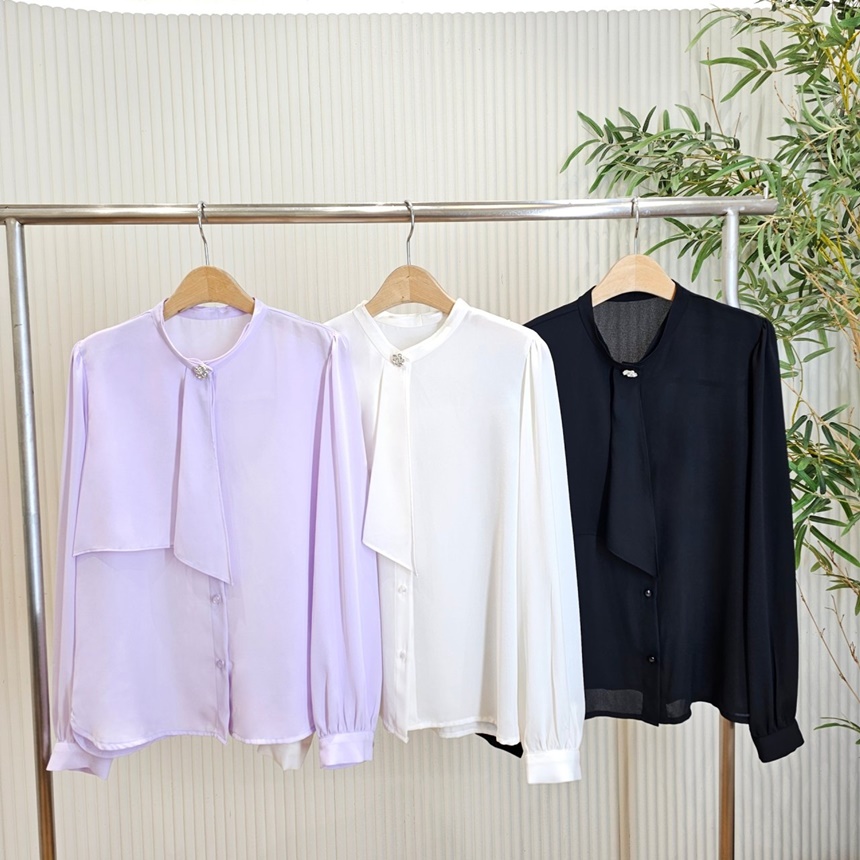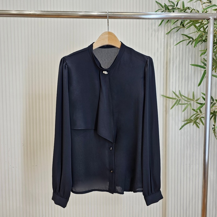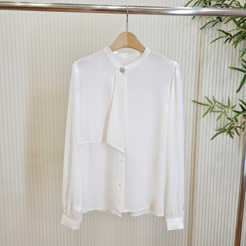 우아한 큐빅 브로치 타이 쉬폰 블라우스
